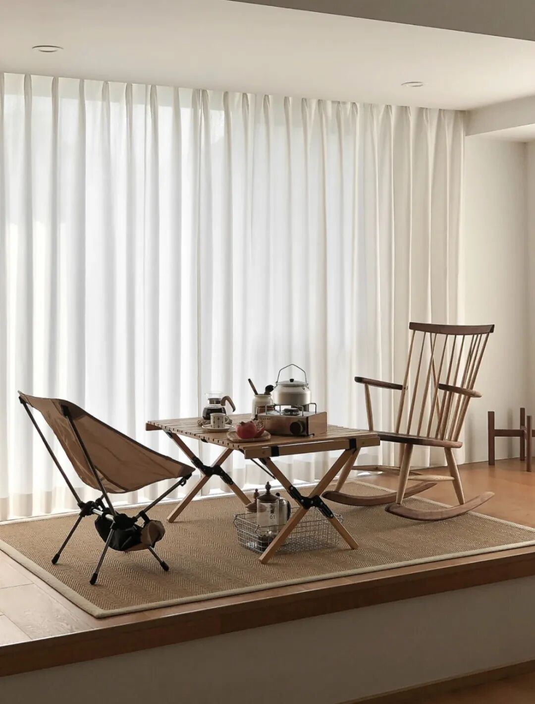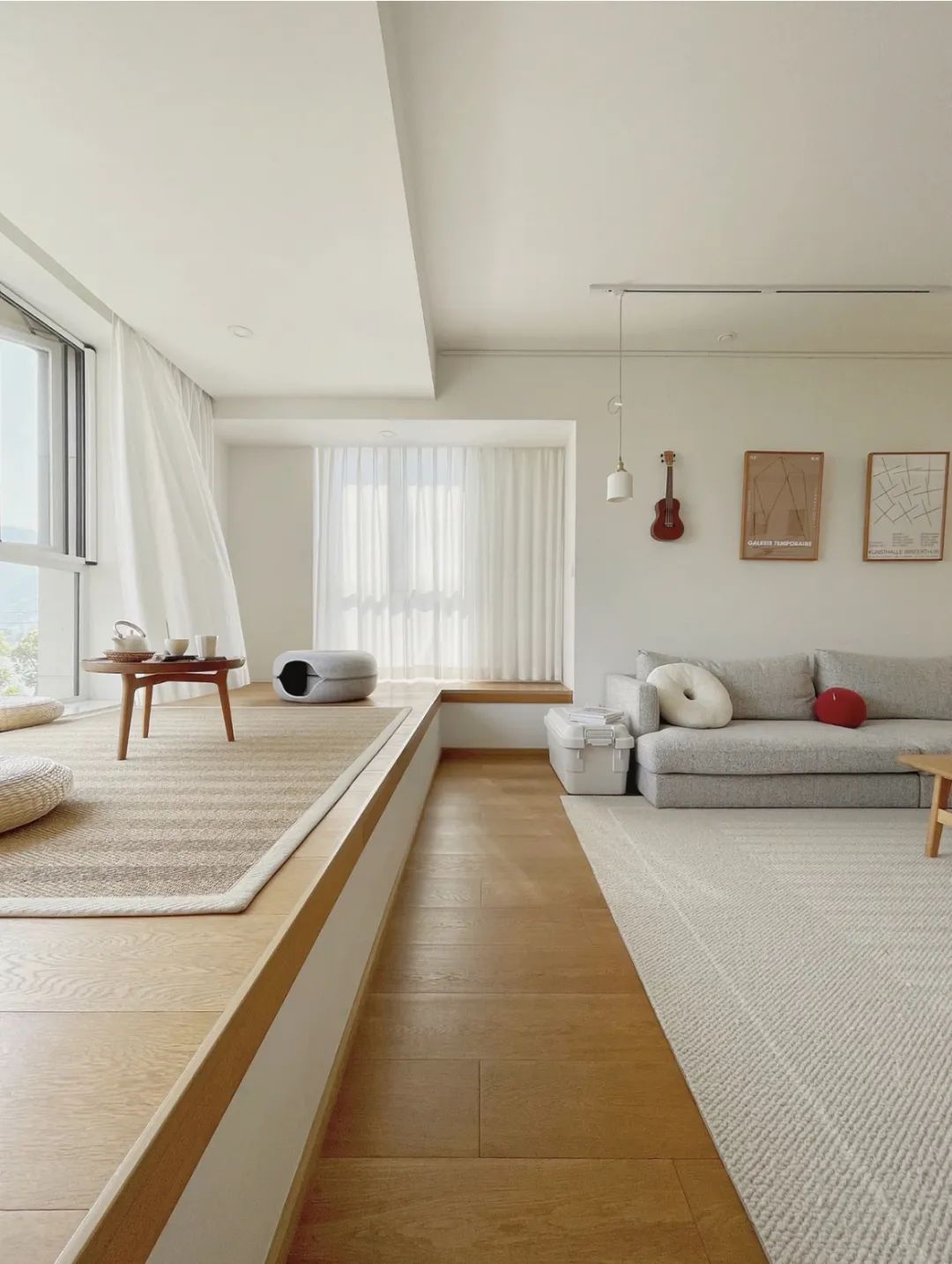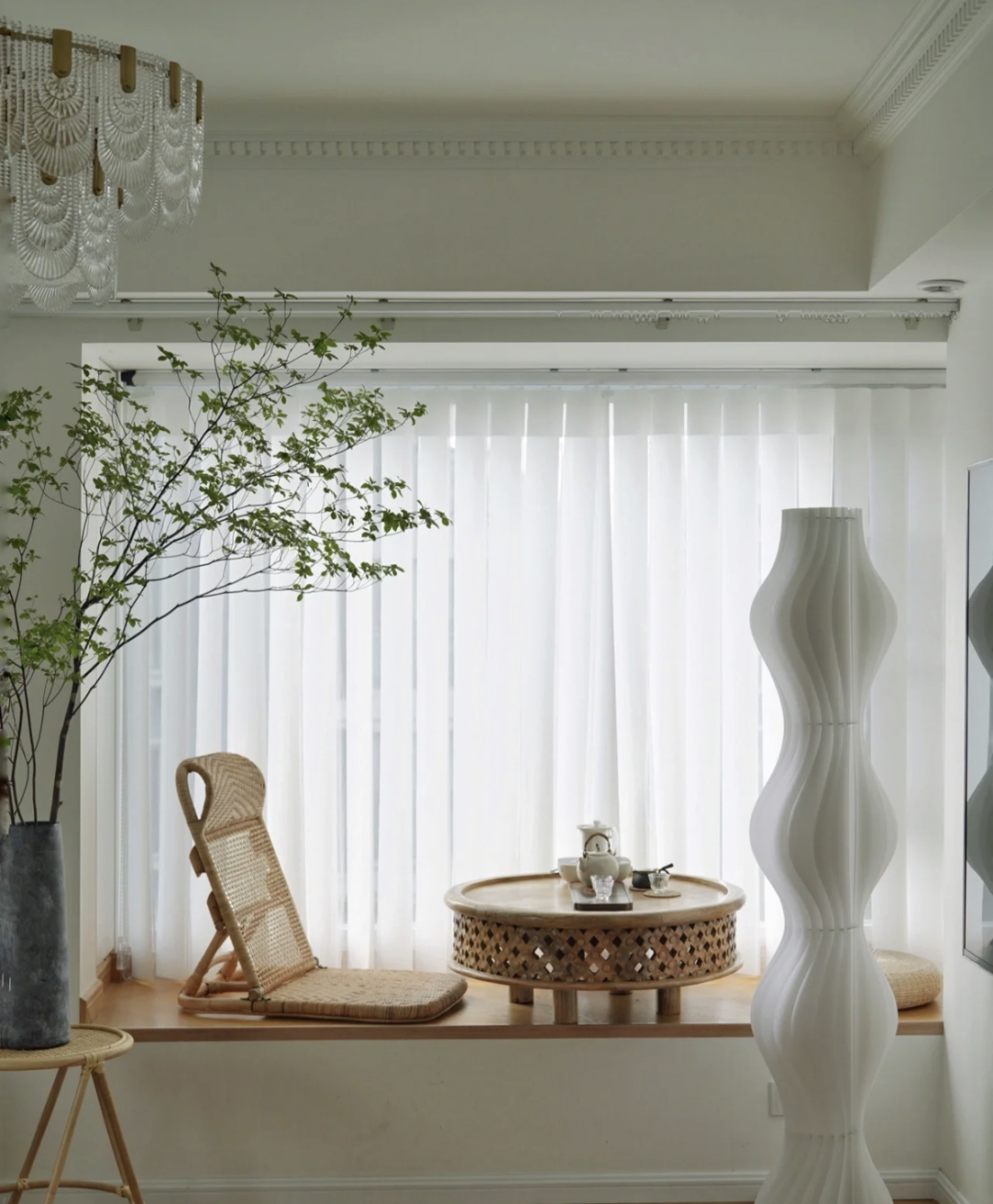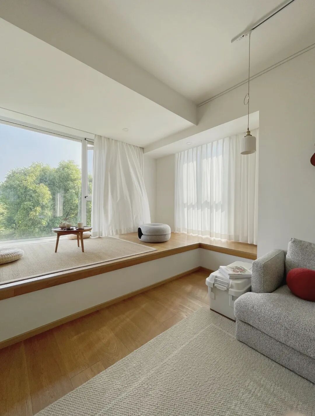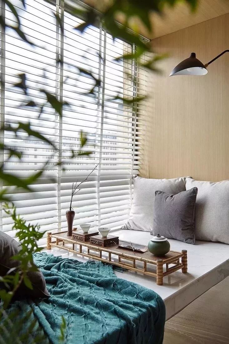 如果想要更大限度的进行利用,可以考虑在落地飘窗处定制一个地台,放一个榻桌、两个靠包,形成喝茶、下棋的娱乐空间。
