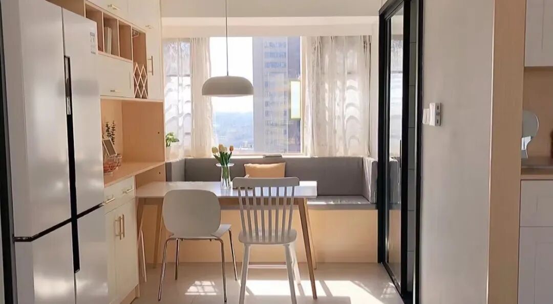 与酒柜、餐边柜等进行一体化设计,可以增加更多的实用功能,为空间打造出丰富的层次感,大大提升家居格调。而且在餐厅的飘窗设计成卡座与餐桌结合,还能节省空间。