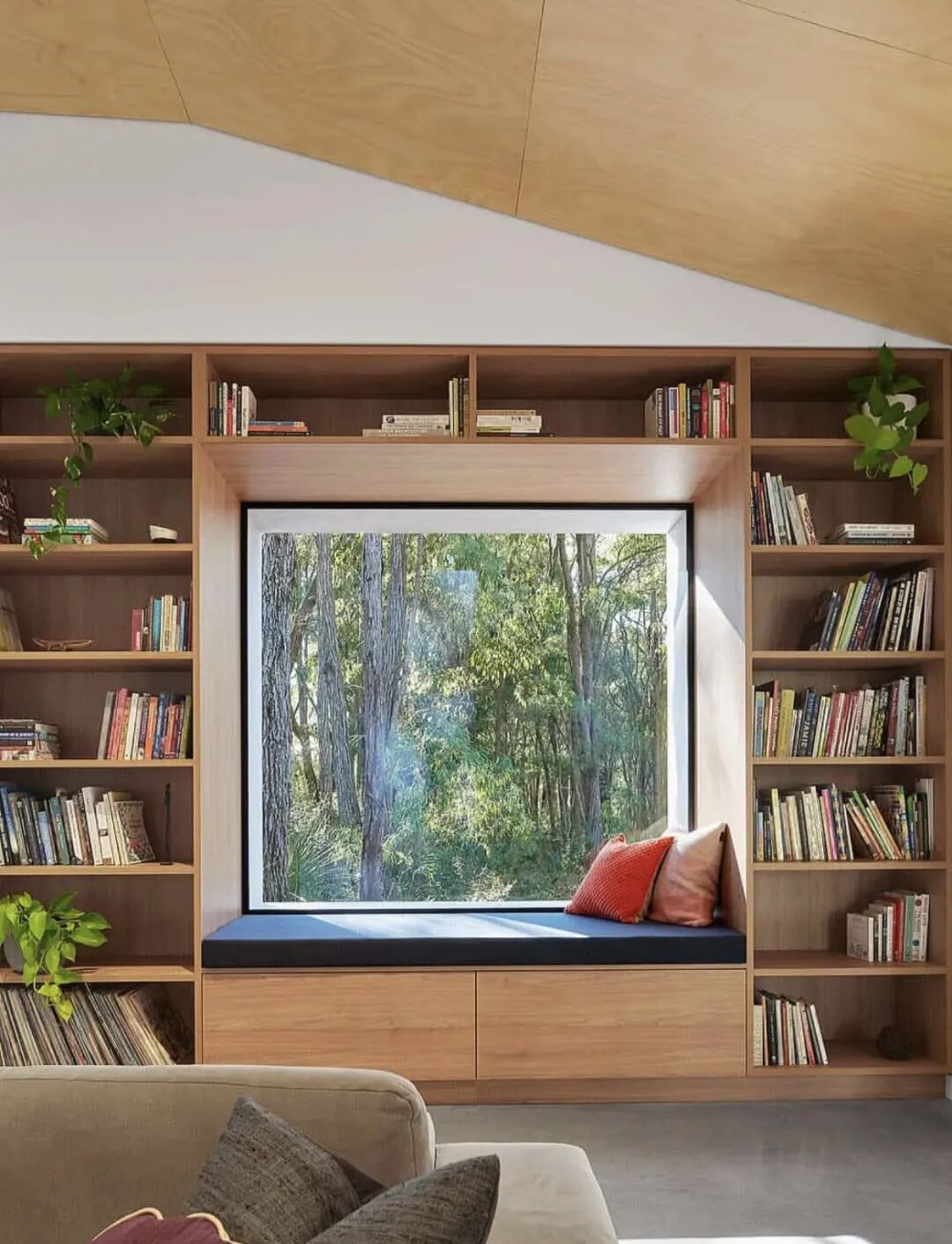 若窗台空间足够宽阔,可在飘窗窗台两侧设计书架,以收纳常用书籍或者摆件,坐在飘窗上迎着阳光面对绿植,感受生活的惬意自在,休闲学习两不误。
