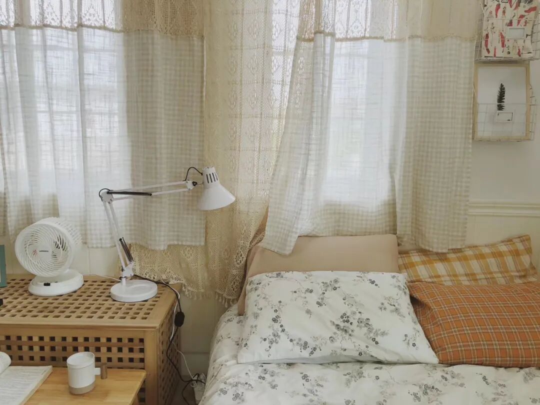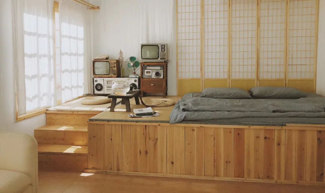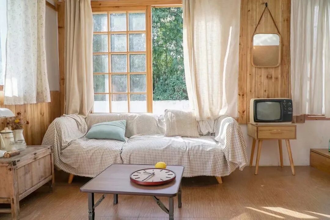 楼房的主体有上下两层,一楼是标准的两室一厅,客厅装满了八九十年代的老物件,每个房间都有不同的主题。二楼则是两个露台+两个卧室,房间都开了大大的窗户,还做了日式推拉门和榻榻米,日漫风的露台超级出片。