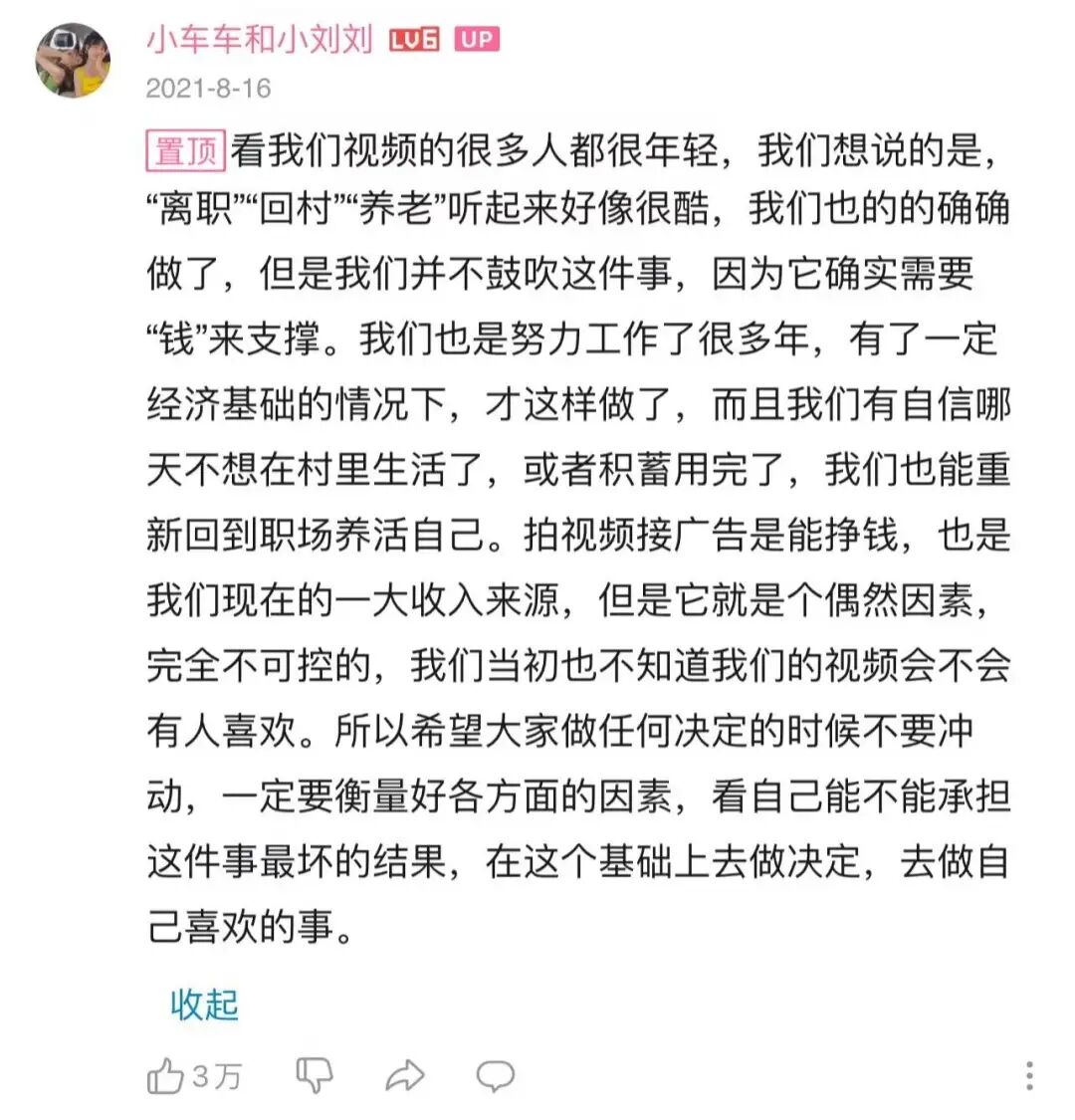 另外农村生活成本虽低,隐居后仍然离不开“赚钱”两个大字,“小车车和小刘刘”曾在一期QA视频中坦言,目前的收入来源主要是接广告,从早期勉强补贴家用,到随着粉丝量的增多,慢慢可以支撑起生活和旅游。