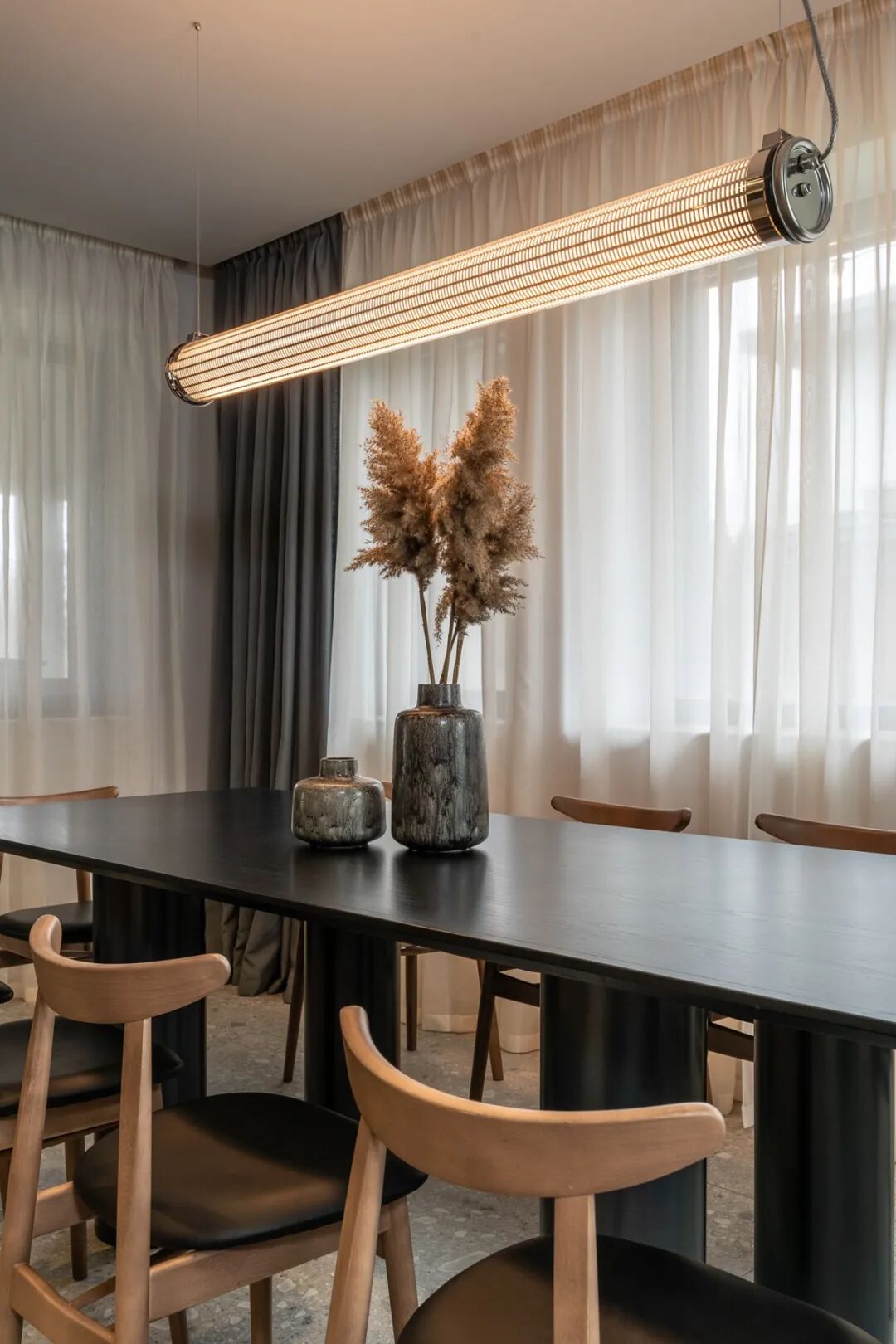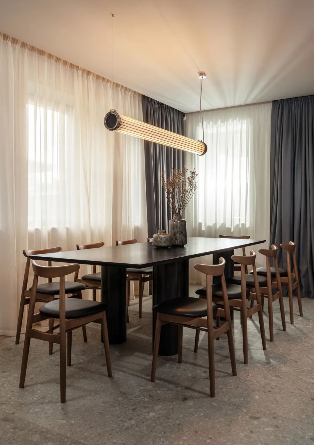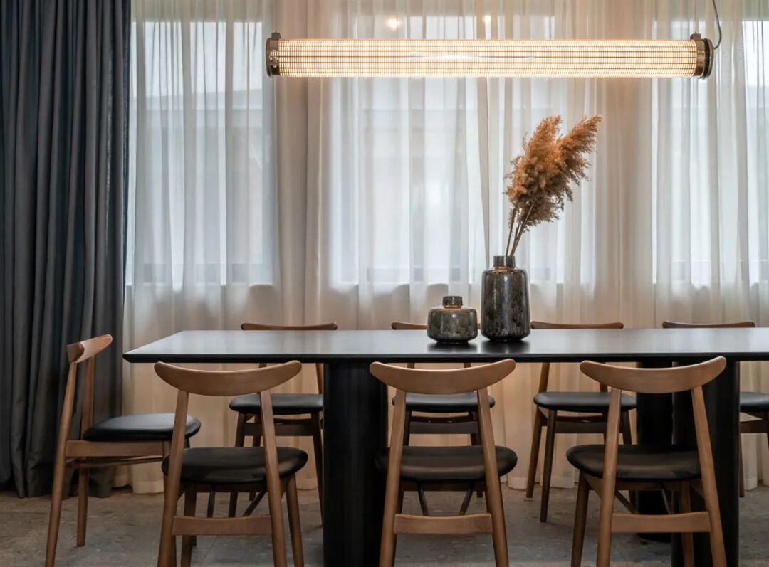 不同于其他人,设计师特意保留主灯照明的这份真切,看似没有藏匿好的电线其实是一种向恣意生活的致敬。原木材质坐凳+小体量的餐桌,与水磨石地面相辅相成,成就一番缱绻悠然的空间氛围。