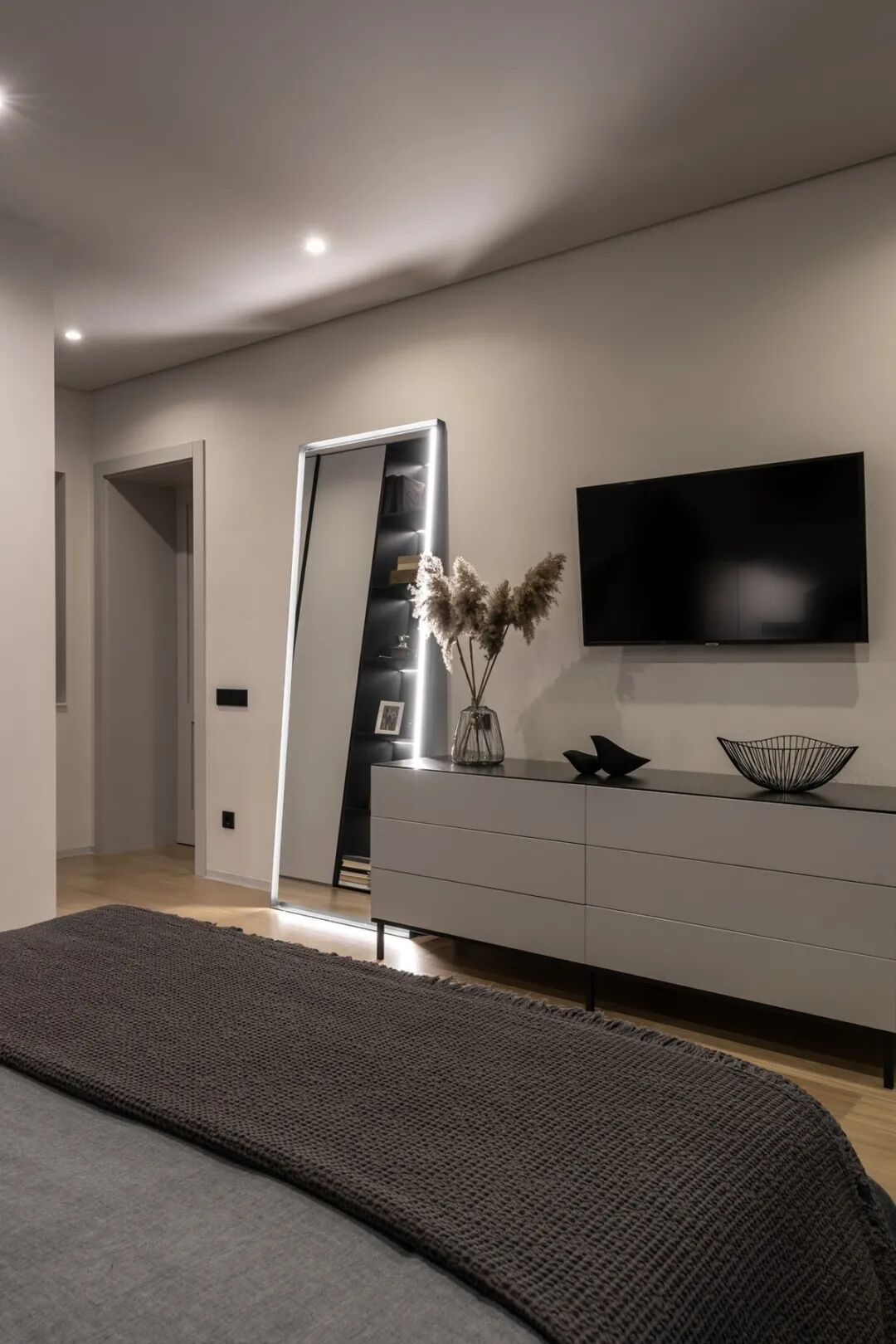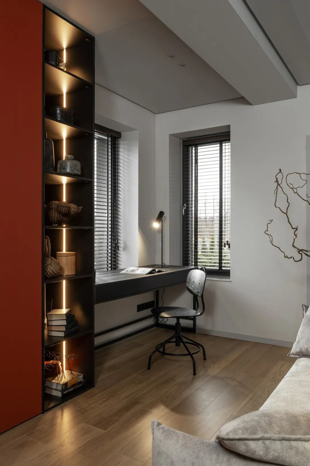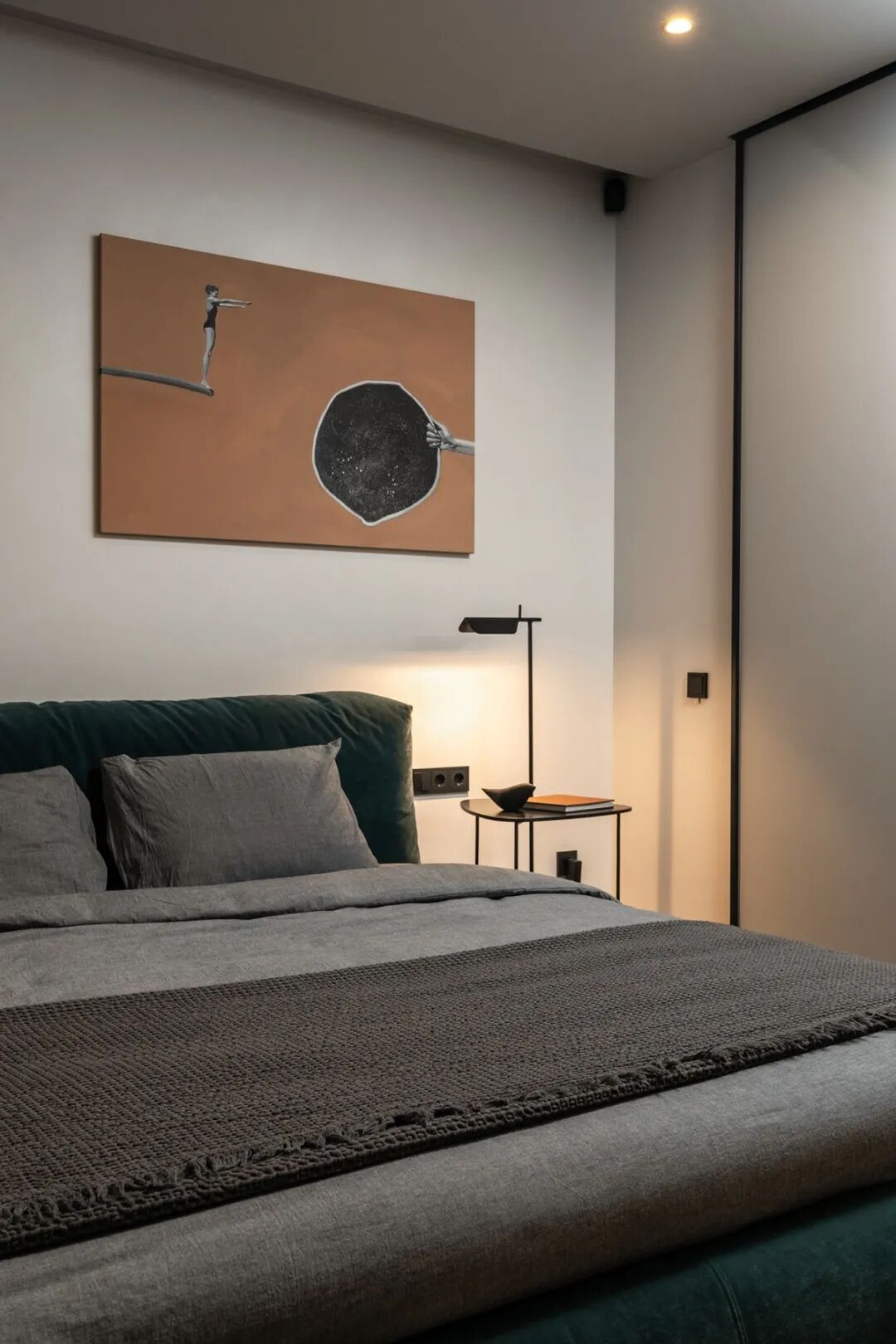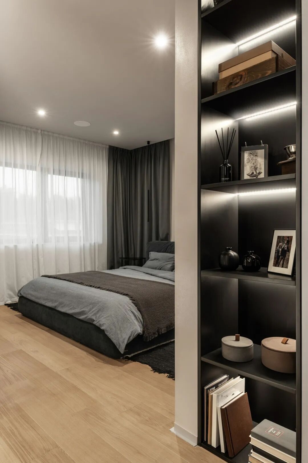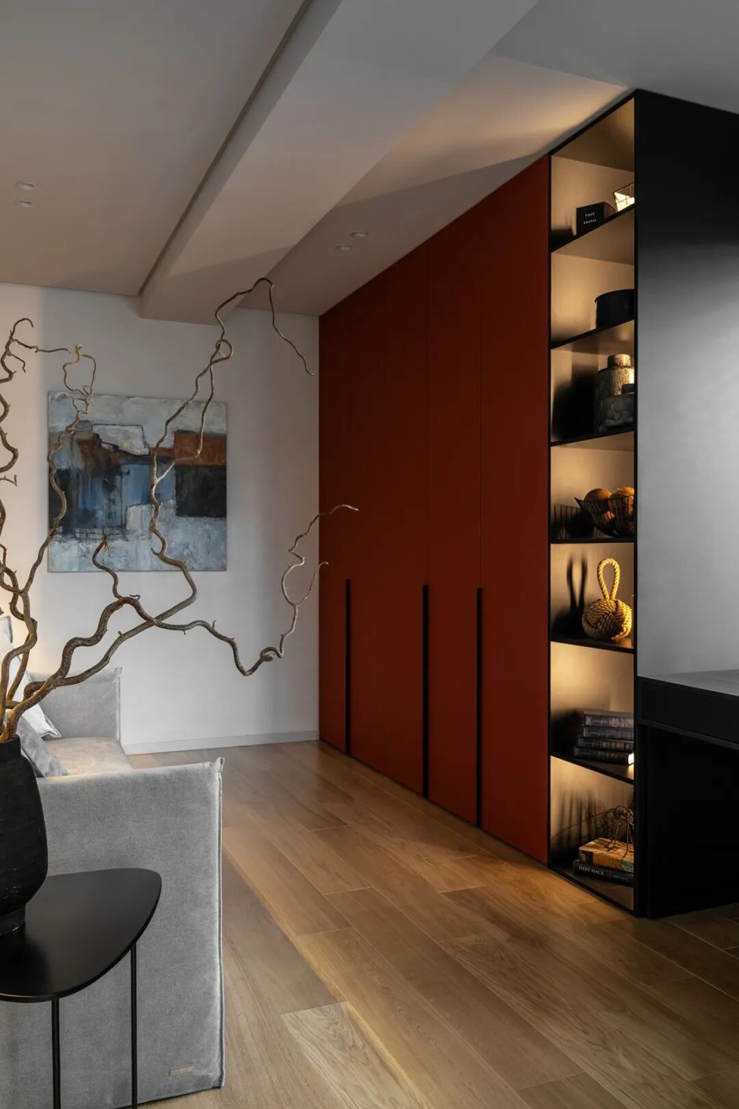 主卧部分同样用极少的颜色勾勒生活的形态,唯一不同的是,复古的到顶立柜与展示柜相连,实用与美观并存,满足功能的同时兼具空间的复古调性。