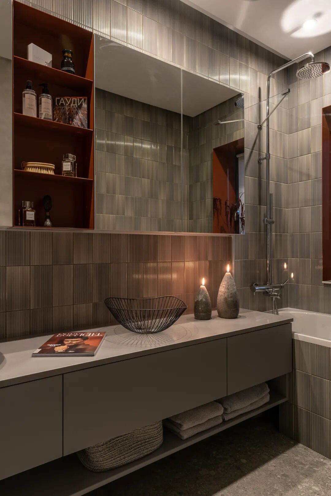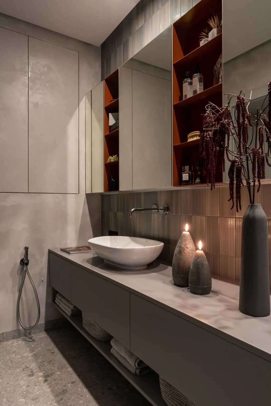 设计师更将这一抹复古棕红延伸至主卫,高级灰与复古红的搭配极尽和谐,大气的台下柜有藏有露,是对生活的细腻品琢。