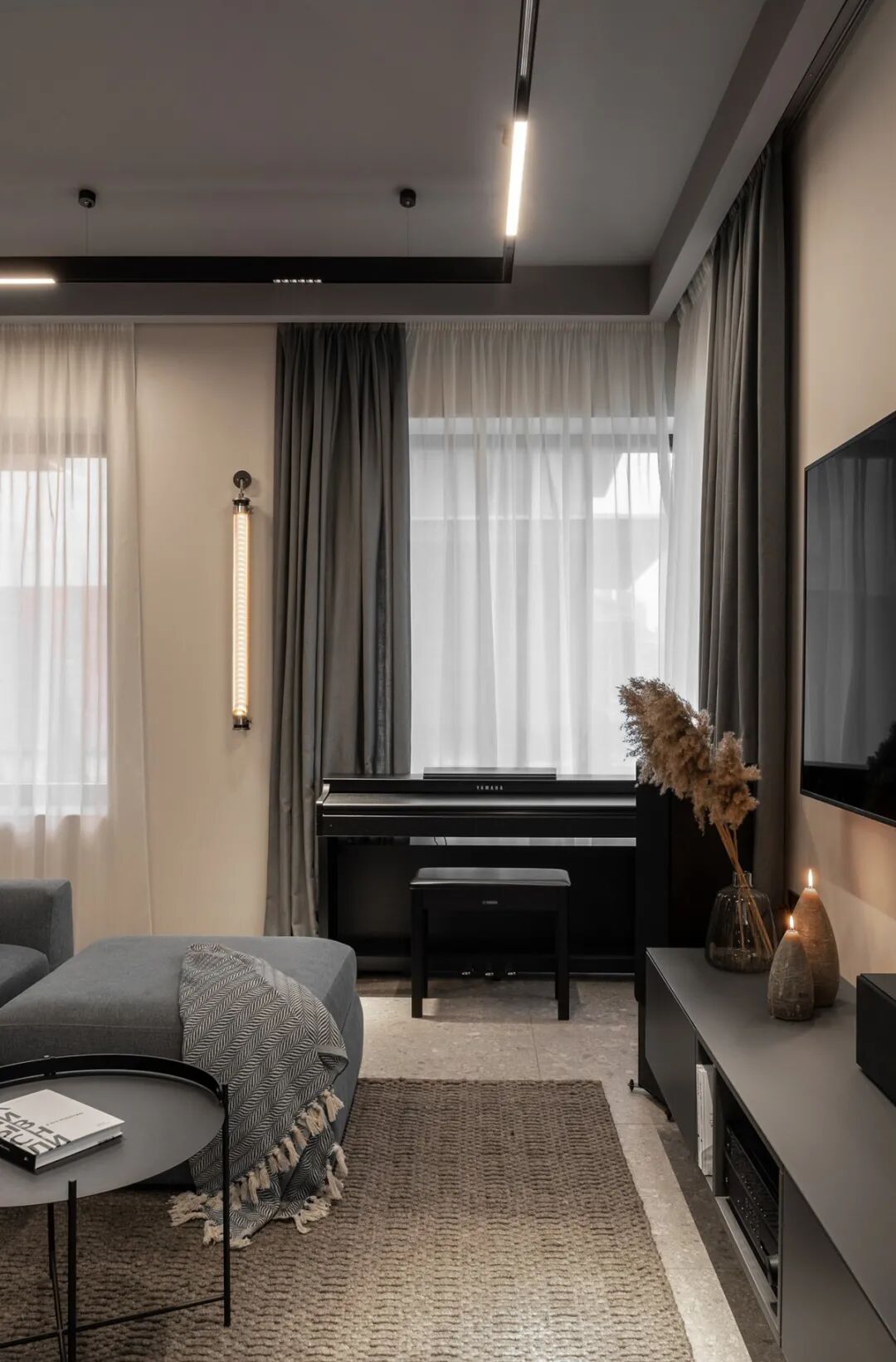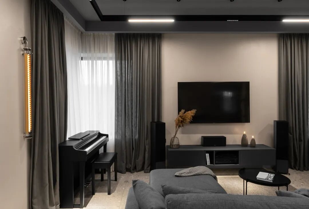 整体空间围绕灰、白、咖色展开,在材质的选用方面也避免给人以“坚硬”之感:垂顺轻薄的双层窗帘,一层遮光,一层朦胧。无主灯的灯条设计摒除圆形灯的钝感,更添一抹自然简约。