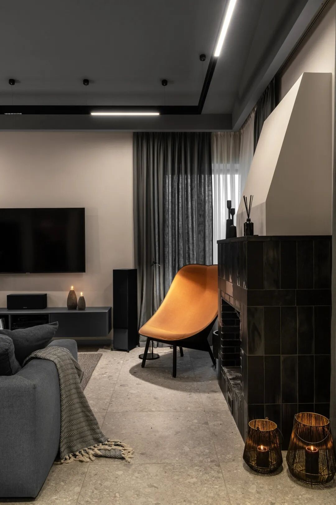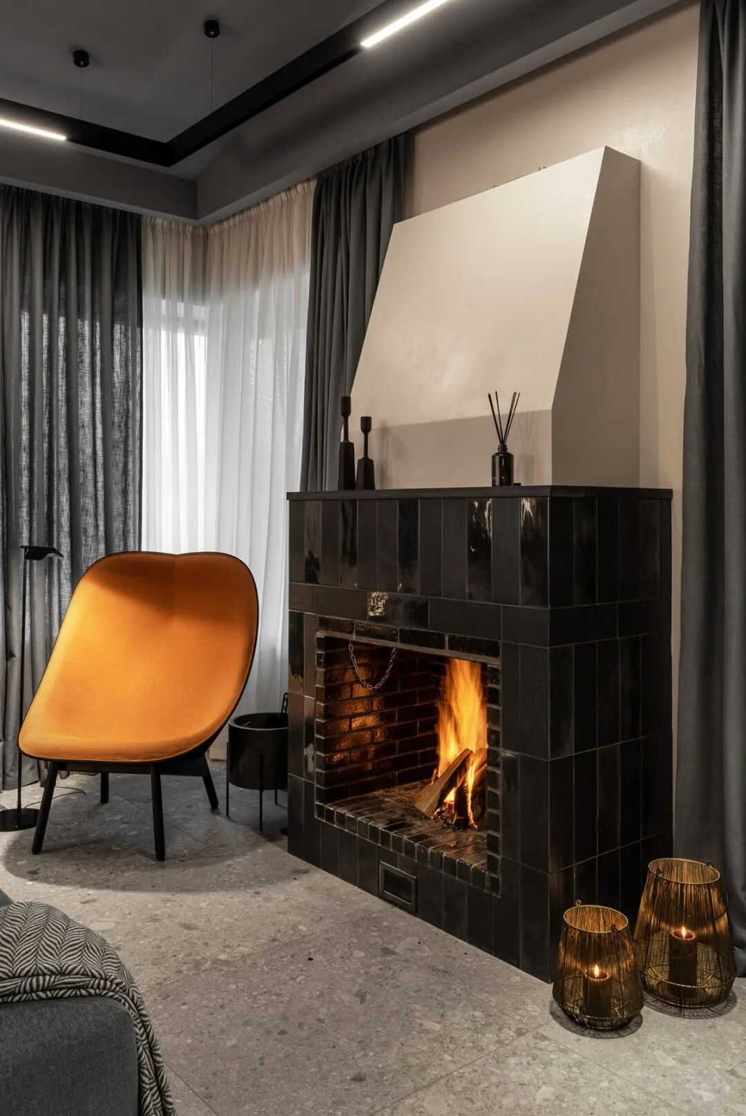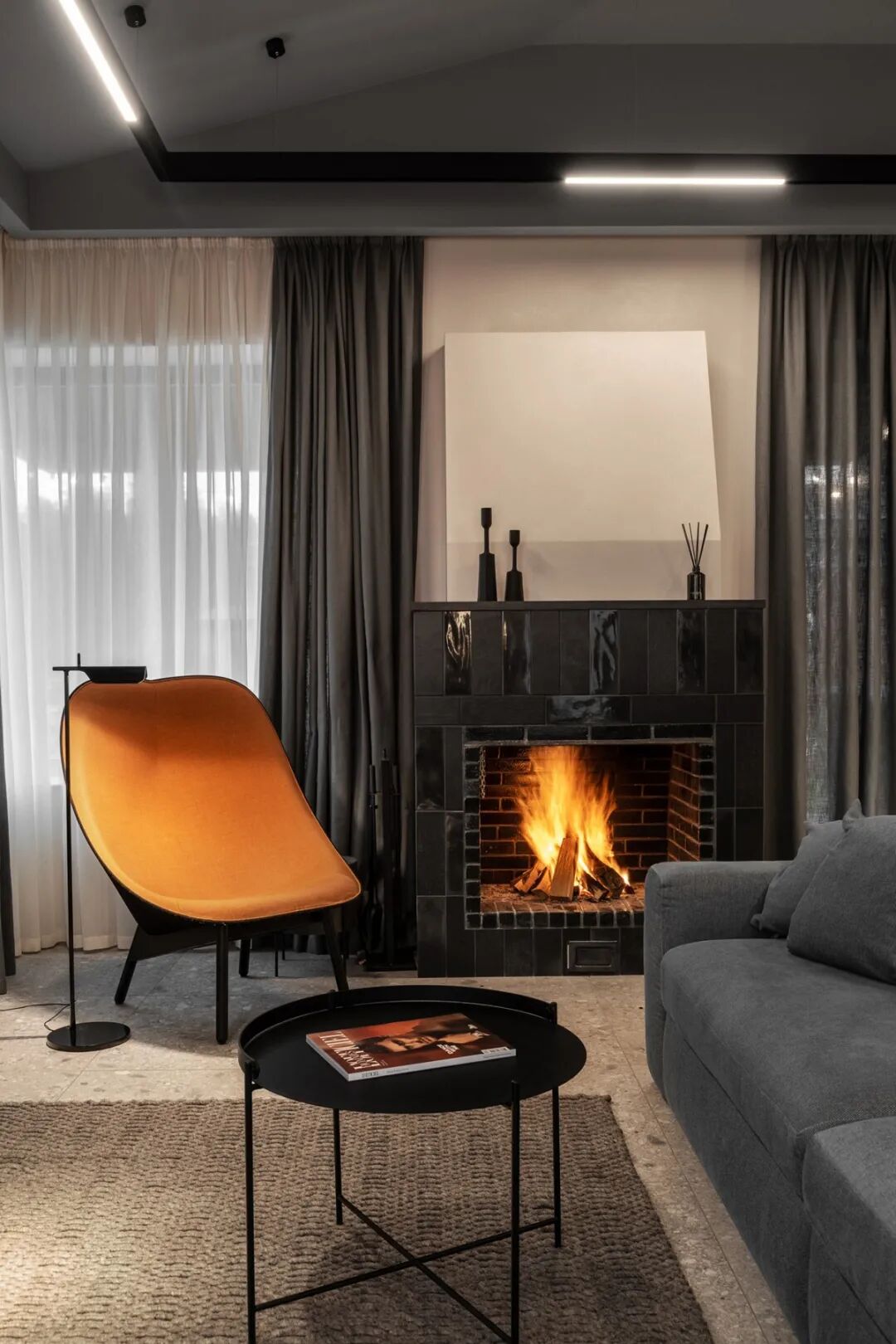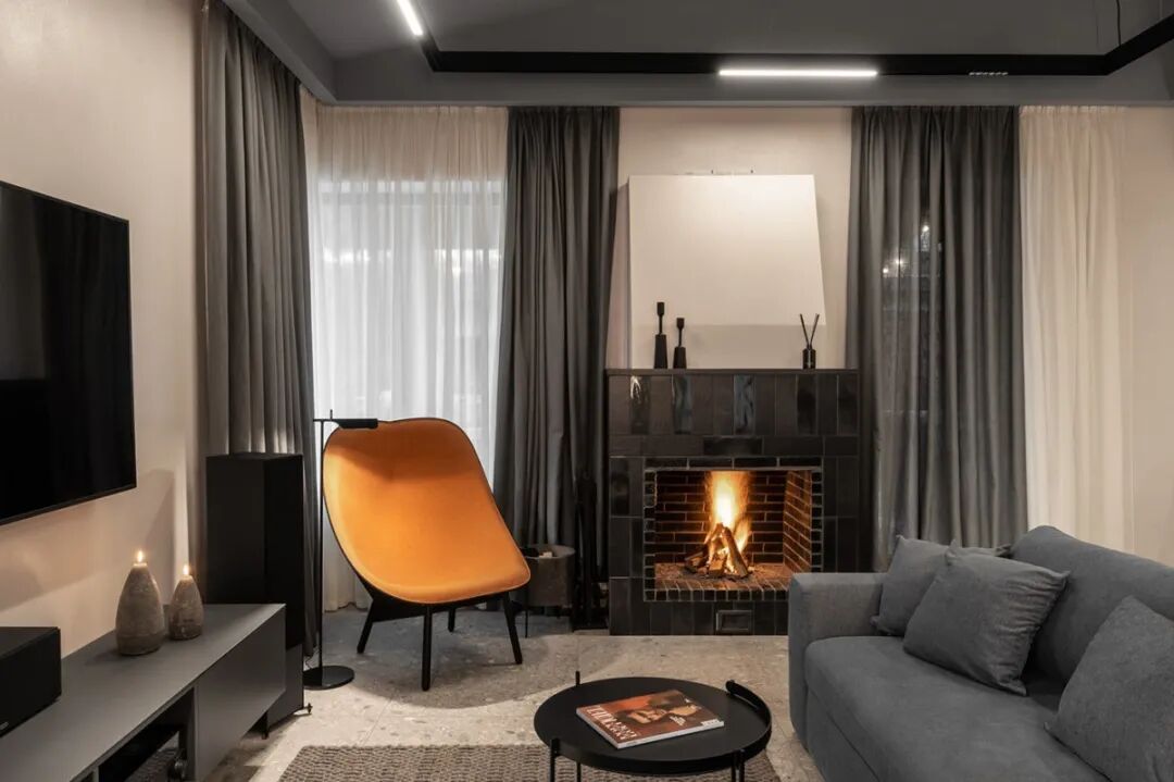 值得一提的是,设计师保留传统壁炉的设置,搭配一把亮橙色的“懒人凳”作为空间的点睛之笔,小小的色彩点缀像是一抹“高光”,打破了空间的平淡。
