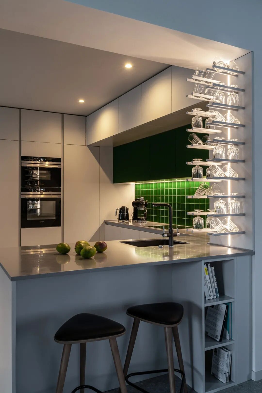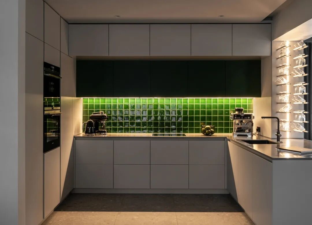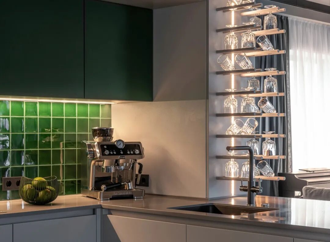 一体化的餐厨设计亮点全在这一抹动人的复古绿上,亮面的马赛克砖折射出波光粼粼的视觉效果,悦动自然。好似油画般灵动耐看。延伸出来的岛台刚好作为吧台使用,抬手就能够到的杯架使休闲时的小酌变得更加轻松自如。
