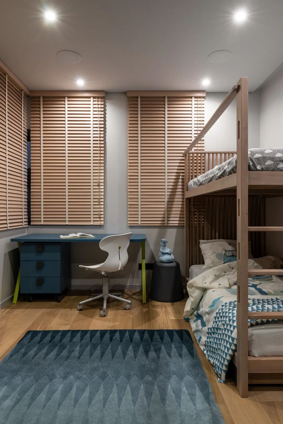 儿童房也简约不简单,灰蓝的传统搭配通过原木的联结变得更加和谐耐看,百叶窗的设计让采光变得唾手可得。