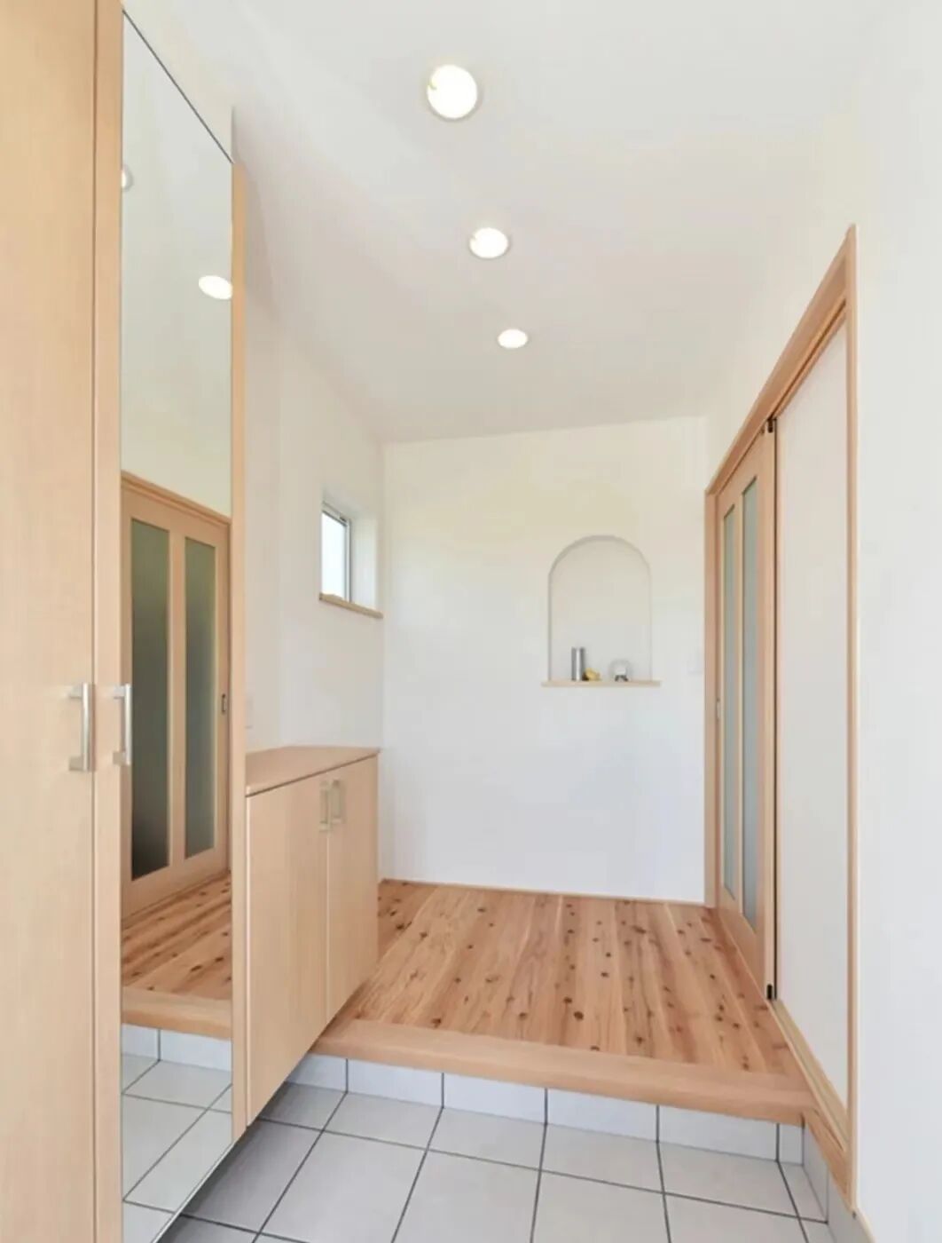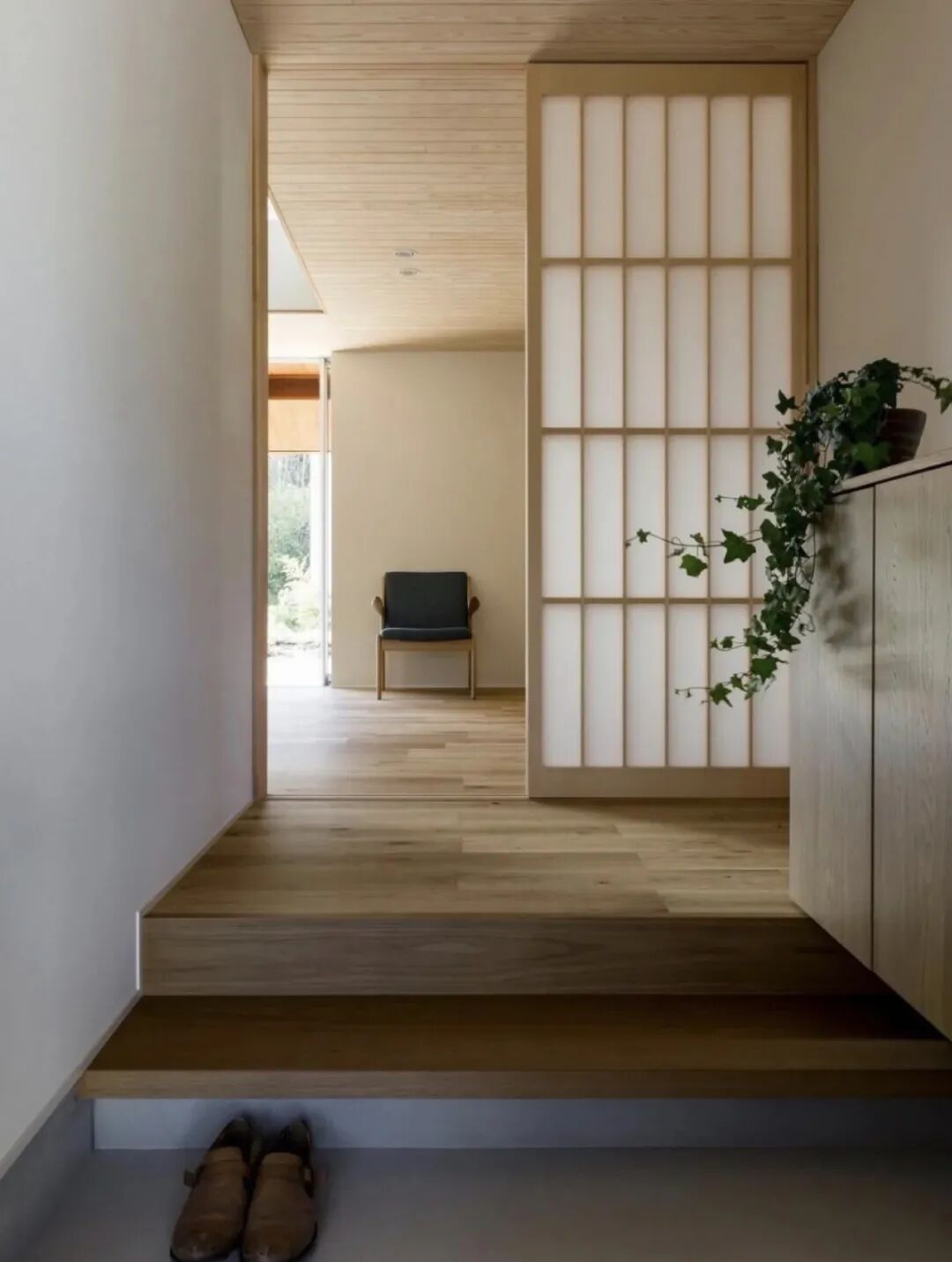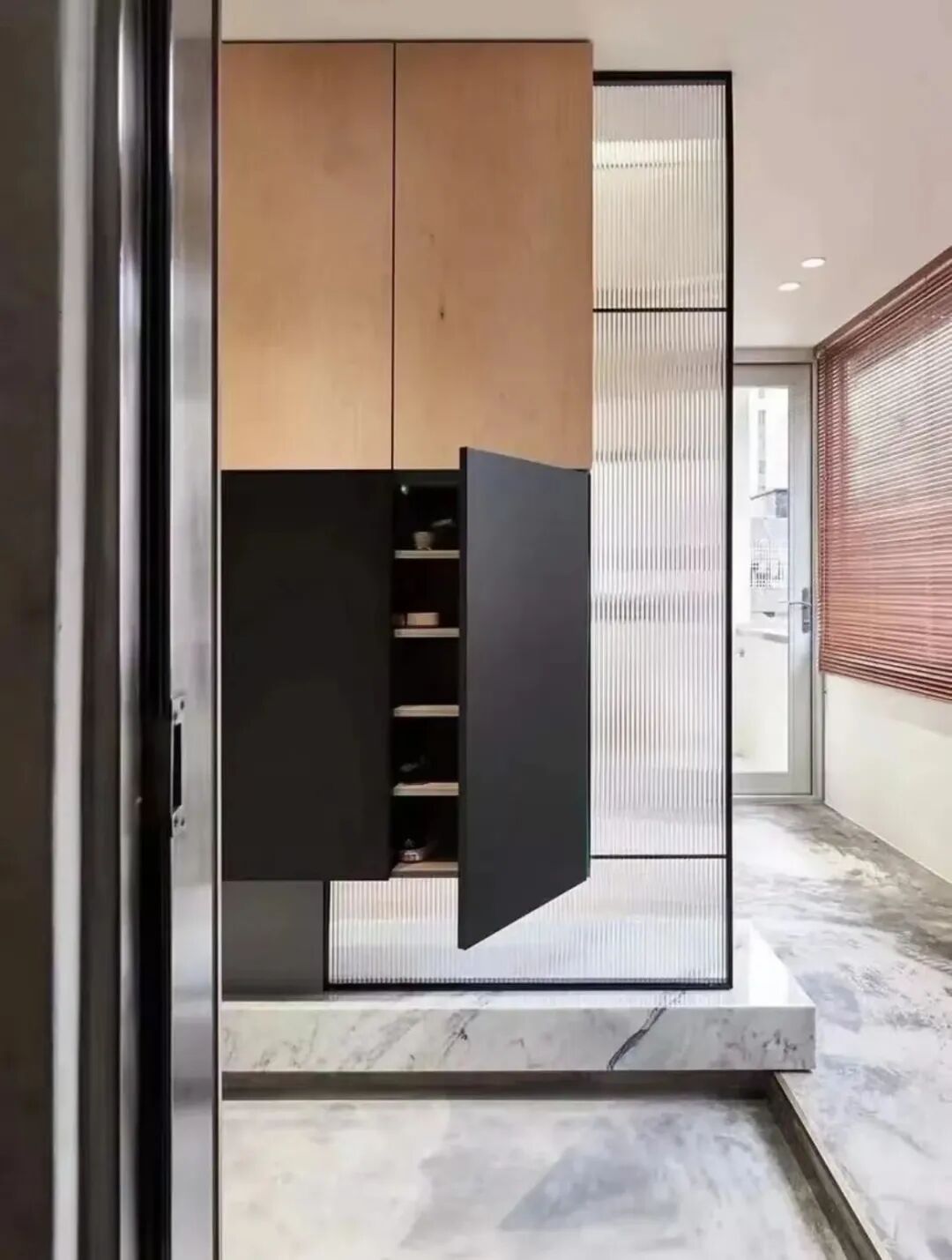 打造下沉式玄关主要有两种方式,一是抬高地面做假下沉,二是借助玄关不铺地暖,打造一个下沉式玄关。