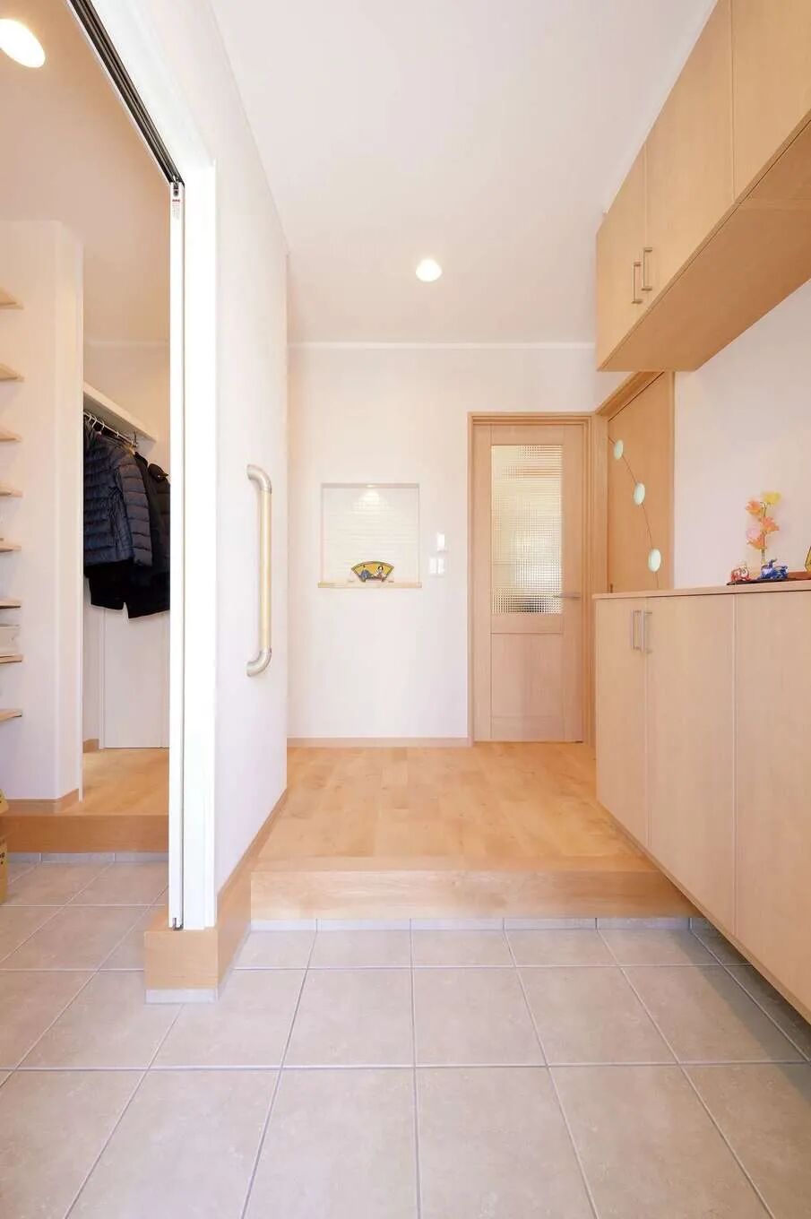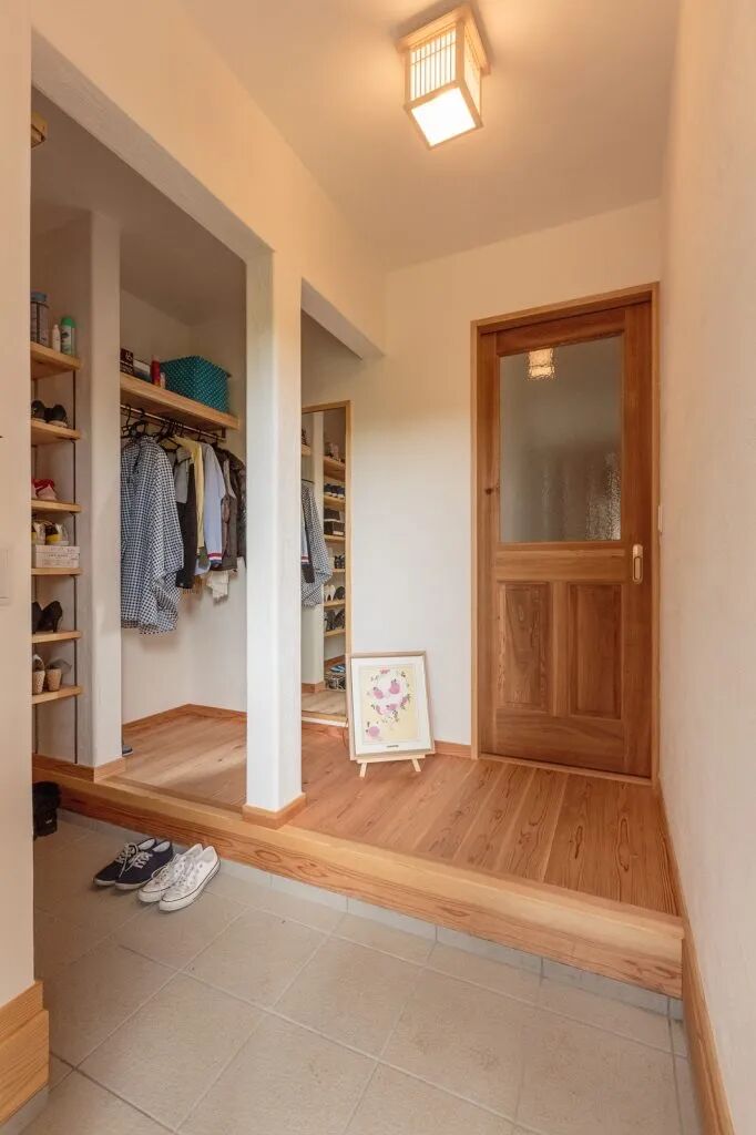 入口玄关处的设计上,日本人对家的洁净十分重视,回到家中更换室内鞋是一件必不可少的事情。换鞋的行为可以看作是一种身份的转换,在外工作学习的疲惫和辛苦在换下鞋子的瞬间,随着鞋子被放置在玄关,走进家的那一刻就要以家人的身份,更加轻松的去生活。