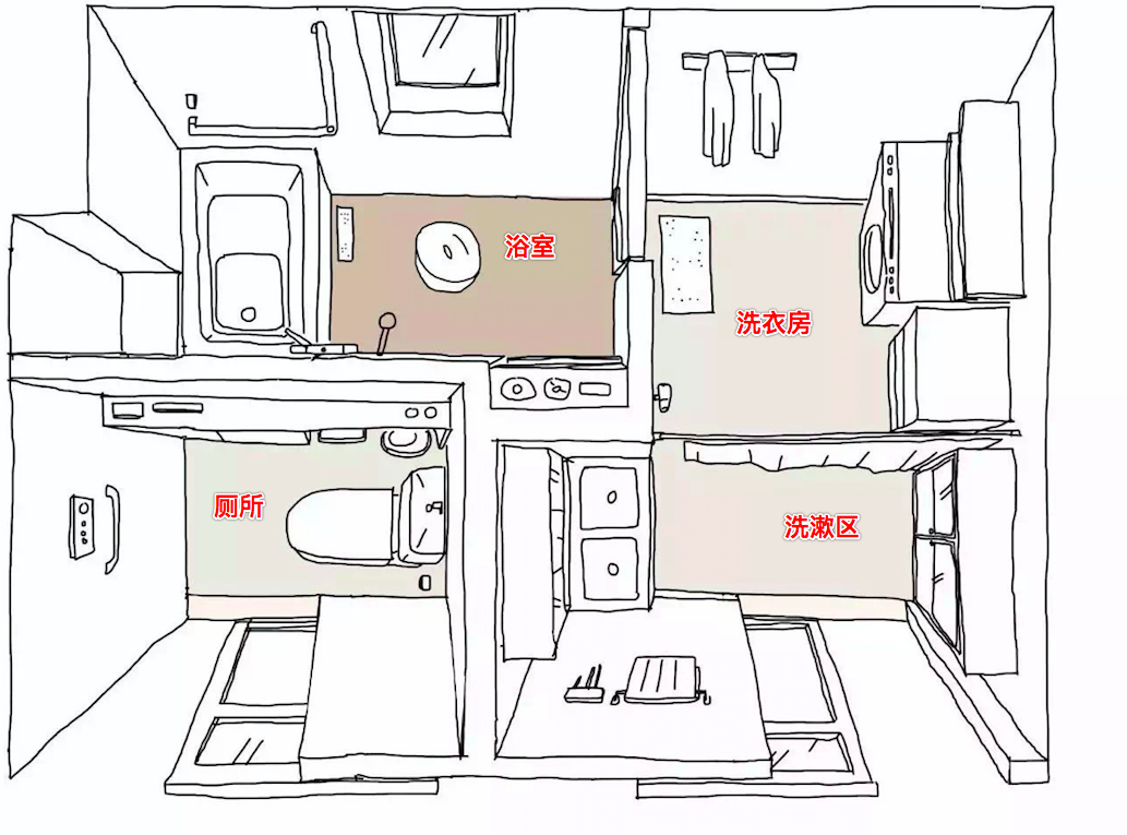 四式指的是洗面台、马桶、浴室(淋浴和浴缸)、洗衣机,所谓的三分离、四分离就是把这几样给隔开以便分别使用,满足一家人也可以同时洗澡上厕所和洗漱。