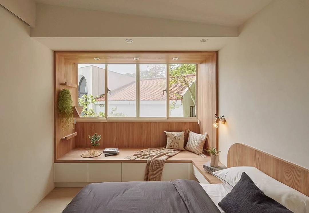 如果飘窗在卧室,可以将飘窗+垫子的高度与床铺+床垫的高度做成一致,让床更宽敞。即使飘窗长度稍短也不影响,可以让小朋友靠窗睡(记得一定要安装防护栏)。如果床头离飘窗较近,还能当床头柜用。