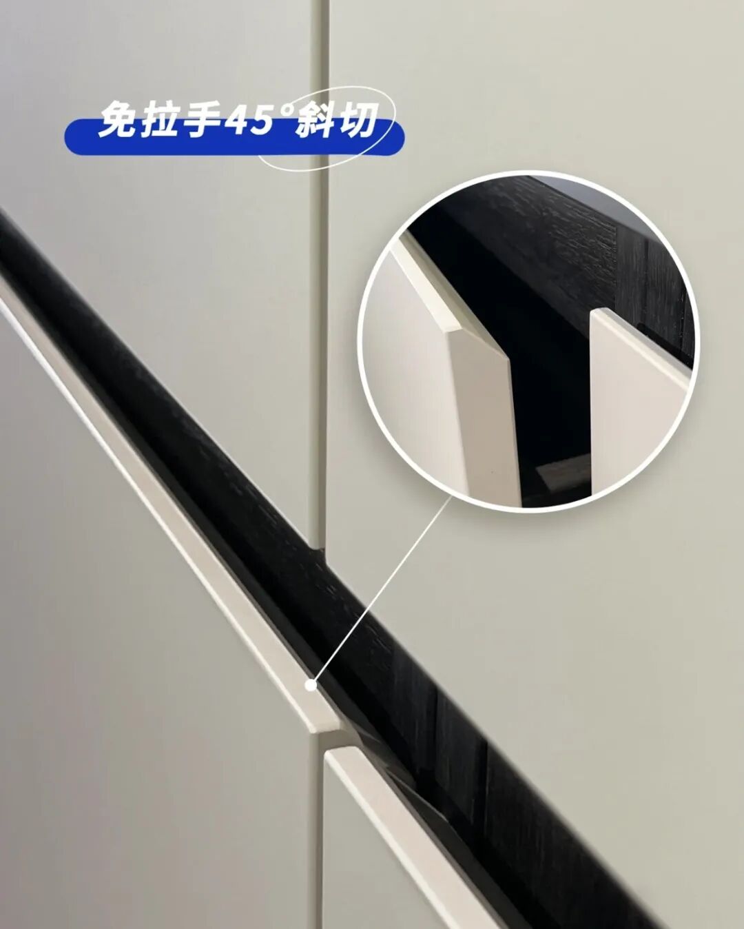 橱柜的话,可以选择柜门斜切45°,与台面间预留2厘米放手指即可,但这种拉手门板,价格偏贵。
