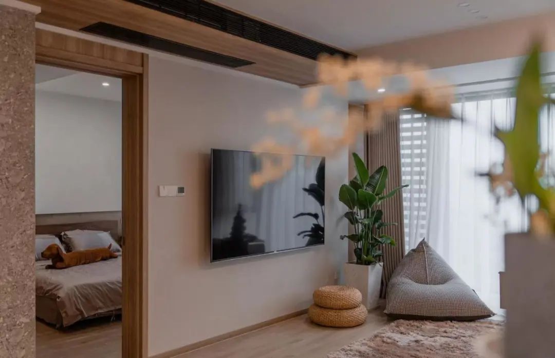 电视墙不做过多的处理,直接安装一台电视机,既做到了简约、利落,又保留下了基本的观影需求。客厅一角,增加了一个小座墩,无论是阅读、休闲,还是随手放置一些物品,都很方便。