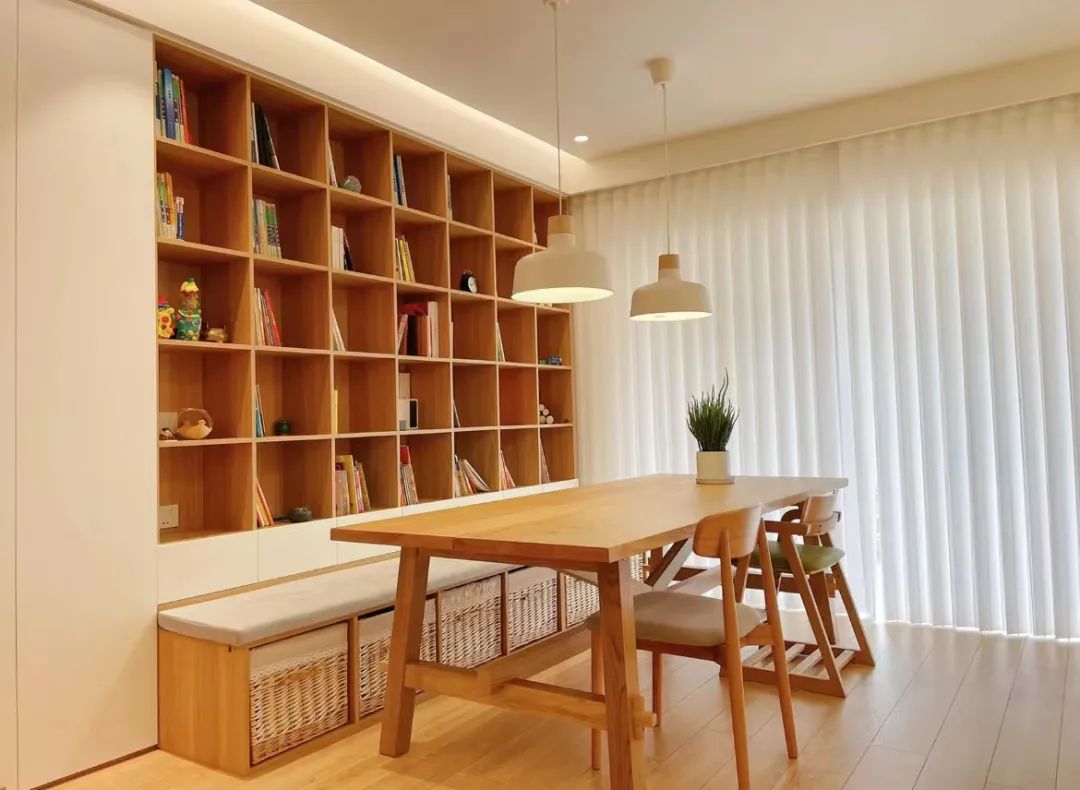 另外,小户型对于储物的需求量也会比较大,直接做一整面储物背景墙,开放区域可以存放一些书籍,或者一些杂物规整摆放,要是觉得杂乱可以将一半做成封闭式的。下面的可移动卡座,也具有储物功能。长桌放在旁边,用餐办公两不误,日常看书也十分惬意。