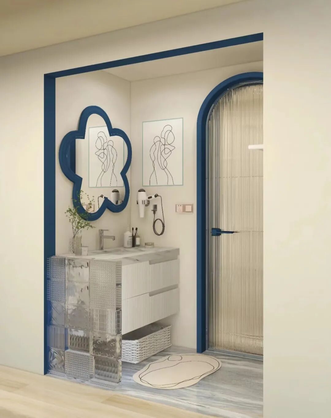 移到外侧的洗漱台,需要单独砌一堵墙做分隔,可以选用实墙不到顶的形式,留出部分空间用玻璃砖填充,通透的同时又有装饰效果。