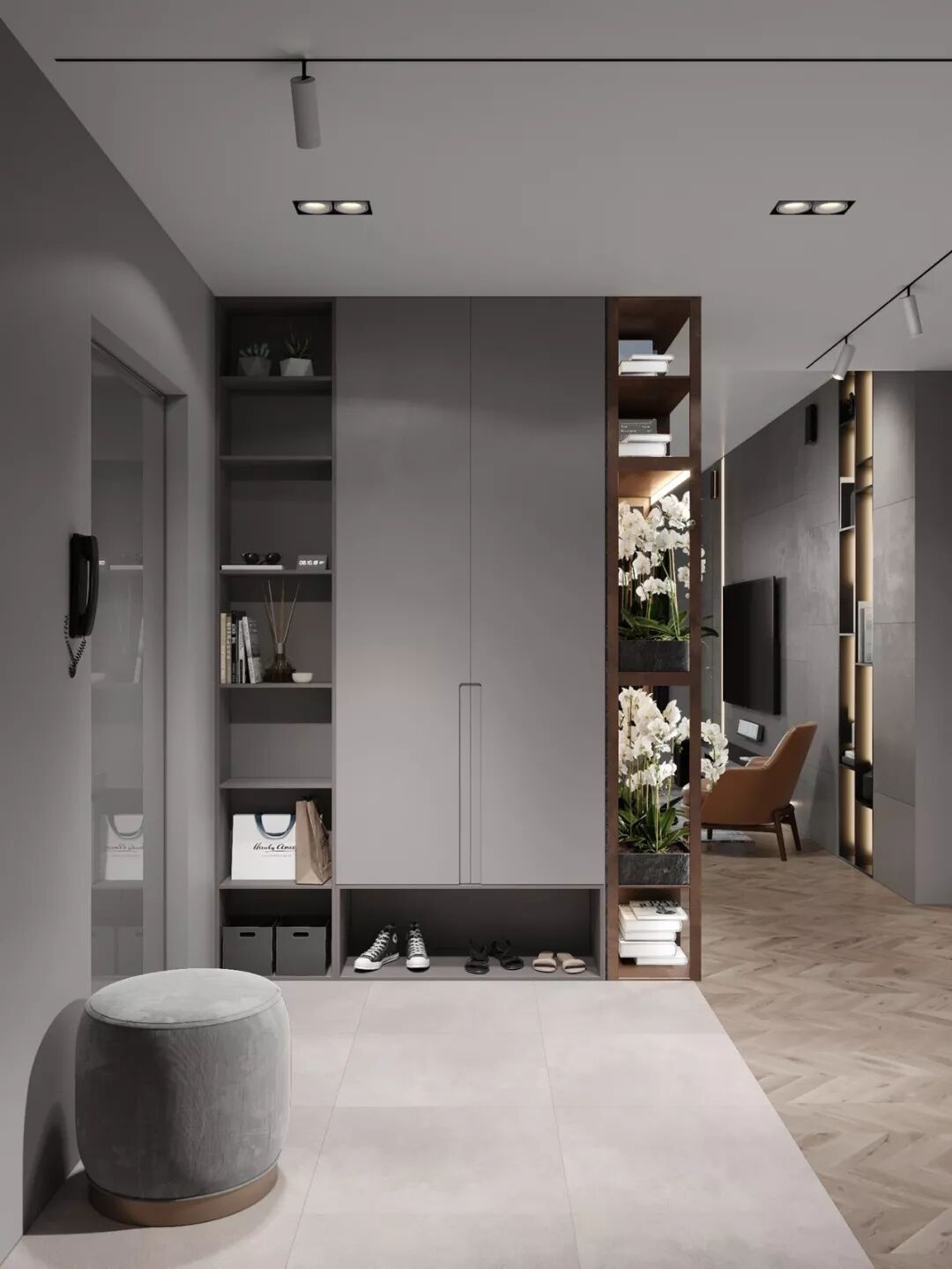 有些空间需要柜体隔断,与独立的入门空间分隔,又让客厅不至于暴露在开门的时候,可以做成柜体隔断收纳鞋子,还能当展示柜装饰空间。