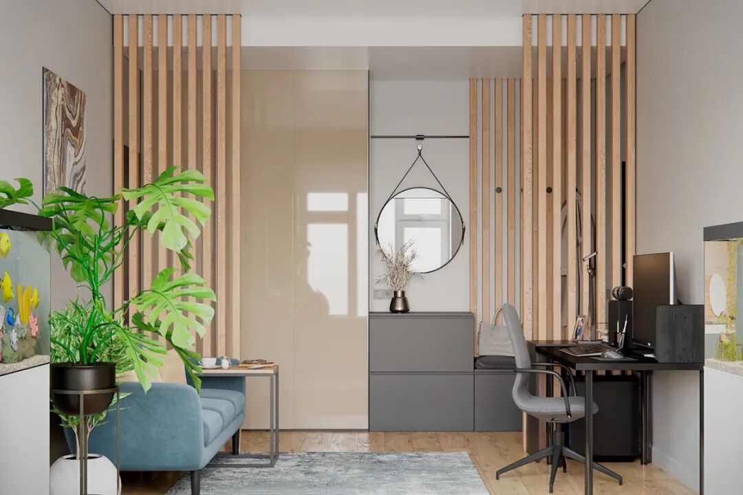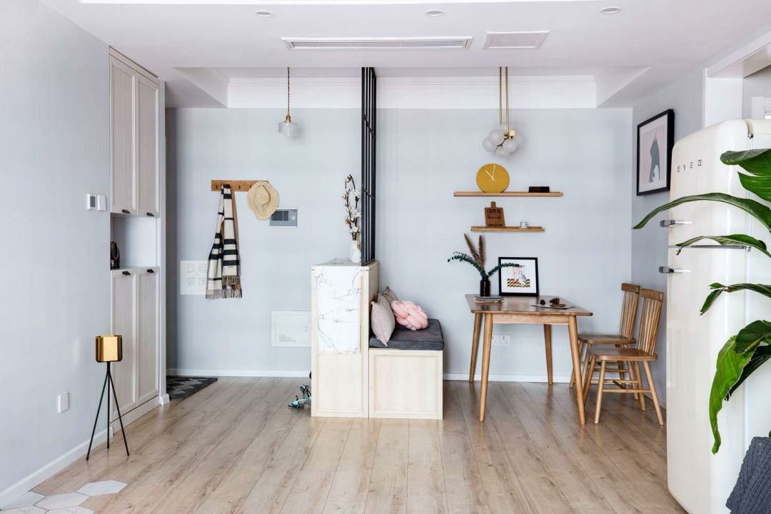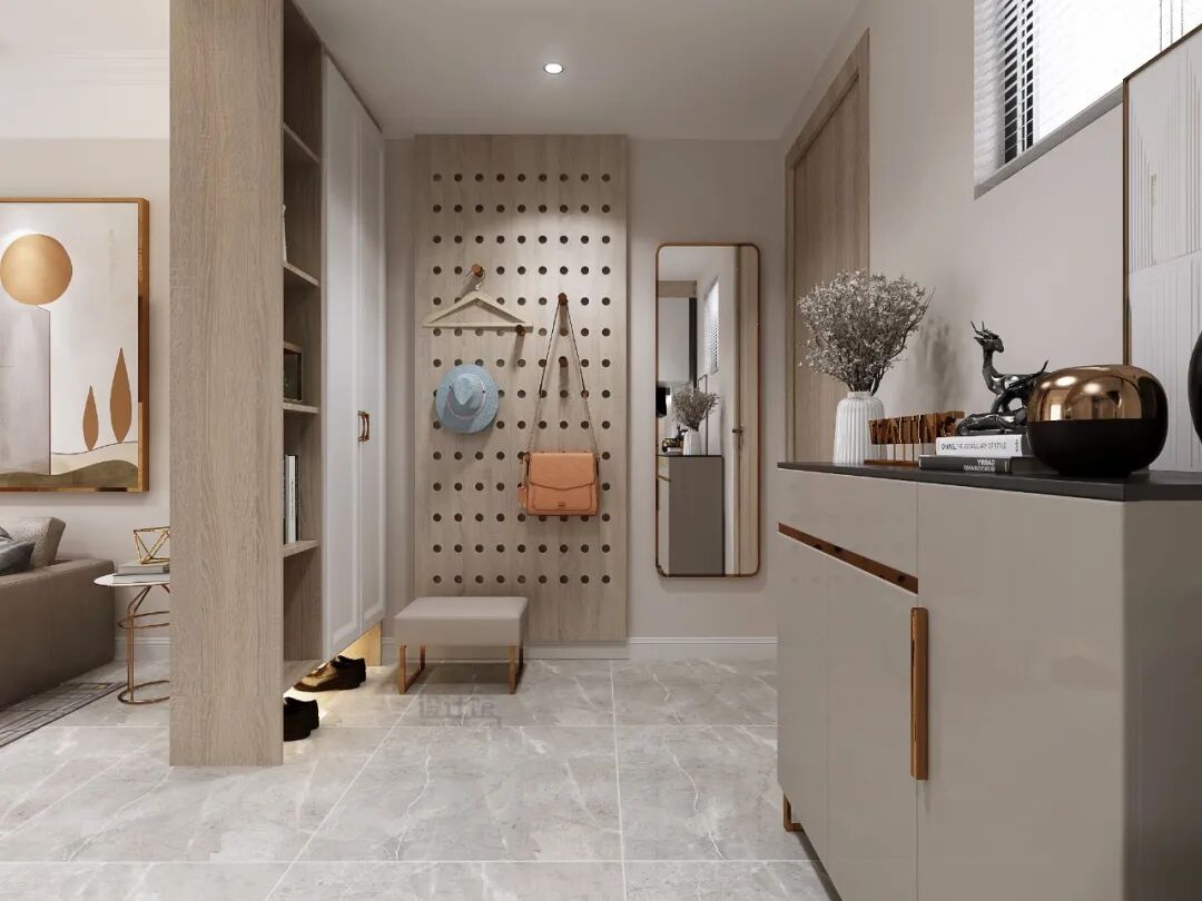 木柜隔断,要按照具体的空间布局来定,可平行于入户门,在入户门前方打柜子,收纳+隔断二合一,提高隐私性;也可以贴门侧墙面,保证空间敞亮。