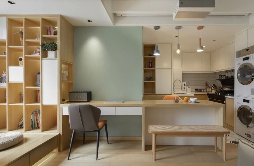 吧台可以替代矮墙隔断划分空间,颜值很高,而且在实际使用的时候,会发现拿取物品真是非常方便,例如在客餐厅附近可以放置,功能非常灵活,不用再增加其他柜体。
