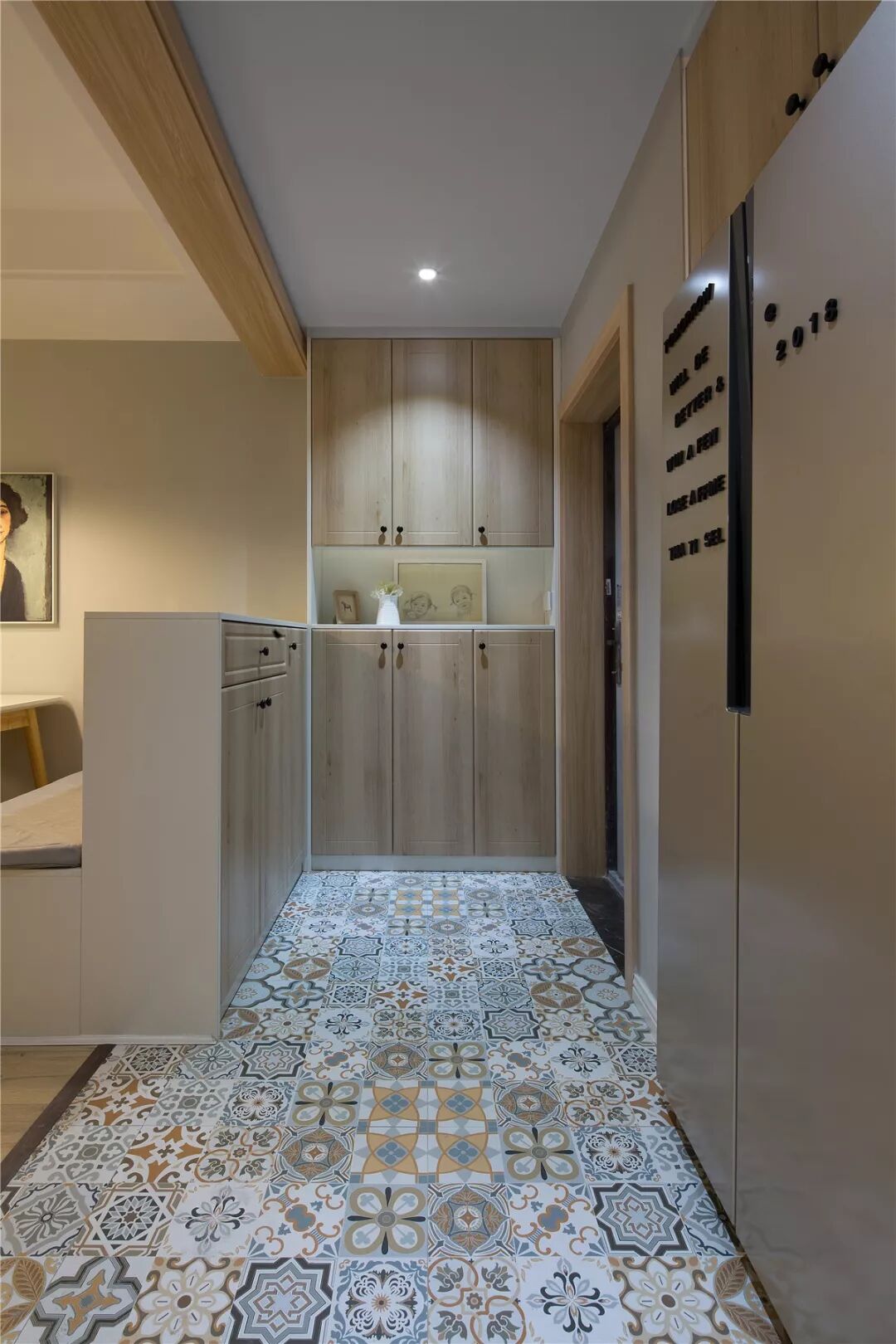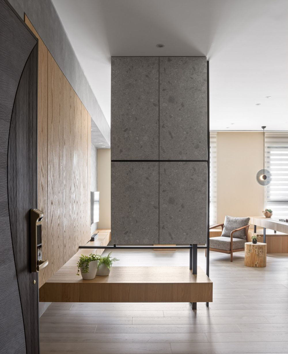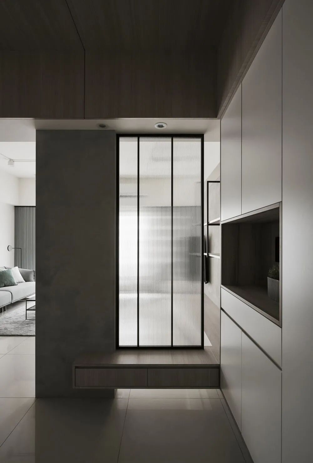 除了整体隔断,还有一种半隔断柜,可以储物,还可以是换鞋坐凳(要根据具体户型来设计)。