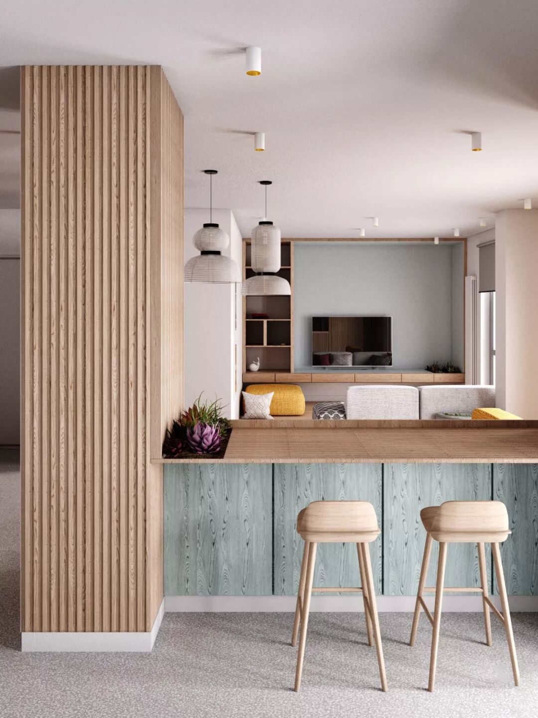 在客厅或者餐厨中间设计吧台,吧台宽度30-40cm为宜,如果办公和收纳宽度60cm为宜,要根据自身需求来定制。