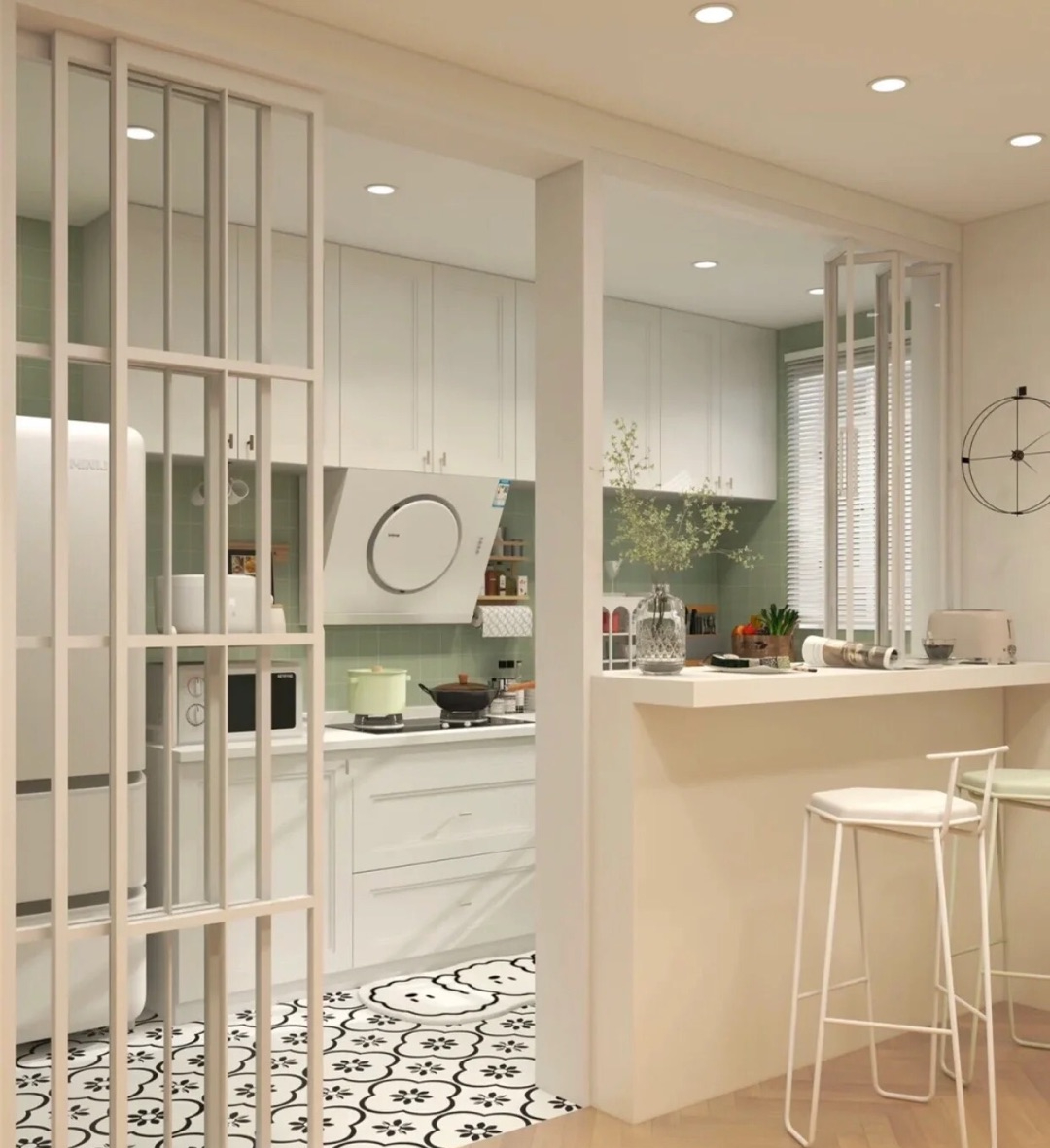 窗户、门做成折叠或联动式推拉门,实现可开可合的厨房设计,做饭时关上来阻挡油烟,比较适用厨房。