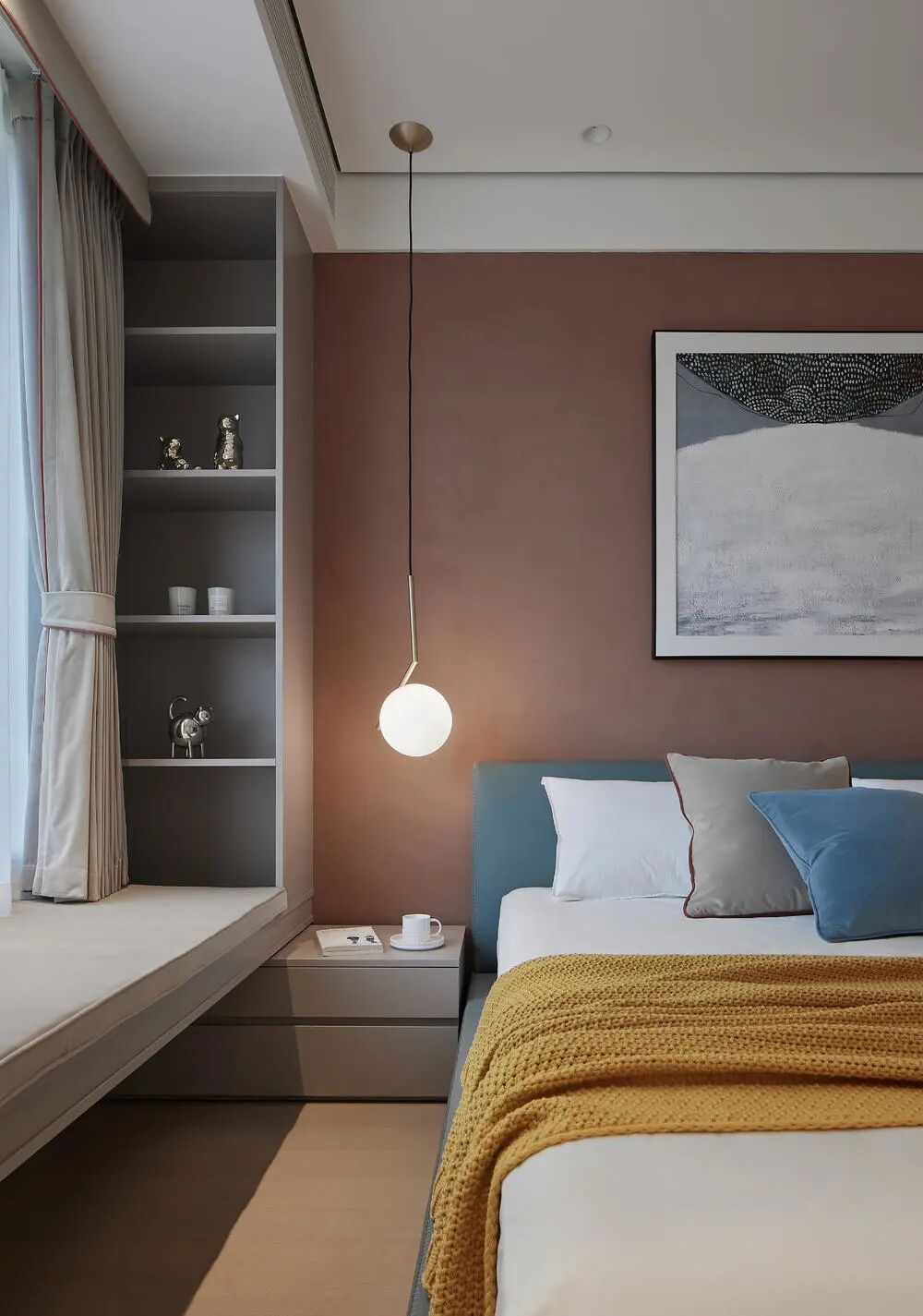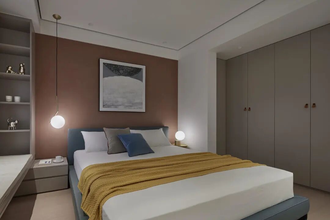 温润柔和,协调的色彩流露出慵懒感,飘逸的纱幔给予轻松自在。大胆的留白在线条与画作的点缀下充满生机。属于我,我们的时刻,光影衬托下,米白色串联藕荷色似乎成了静谧的温馨港湾。一夜酣梦,醒来时心情回甜。