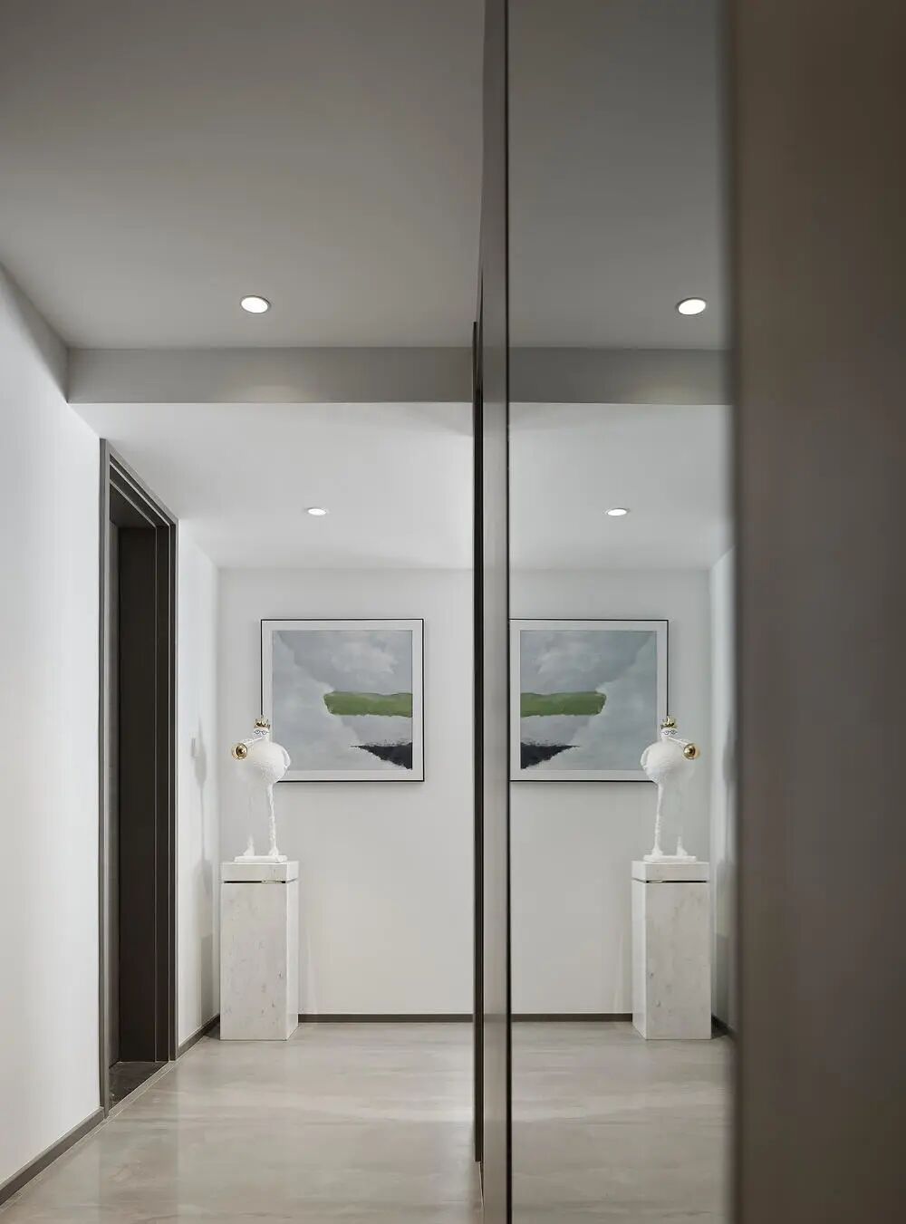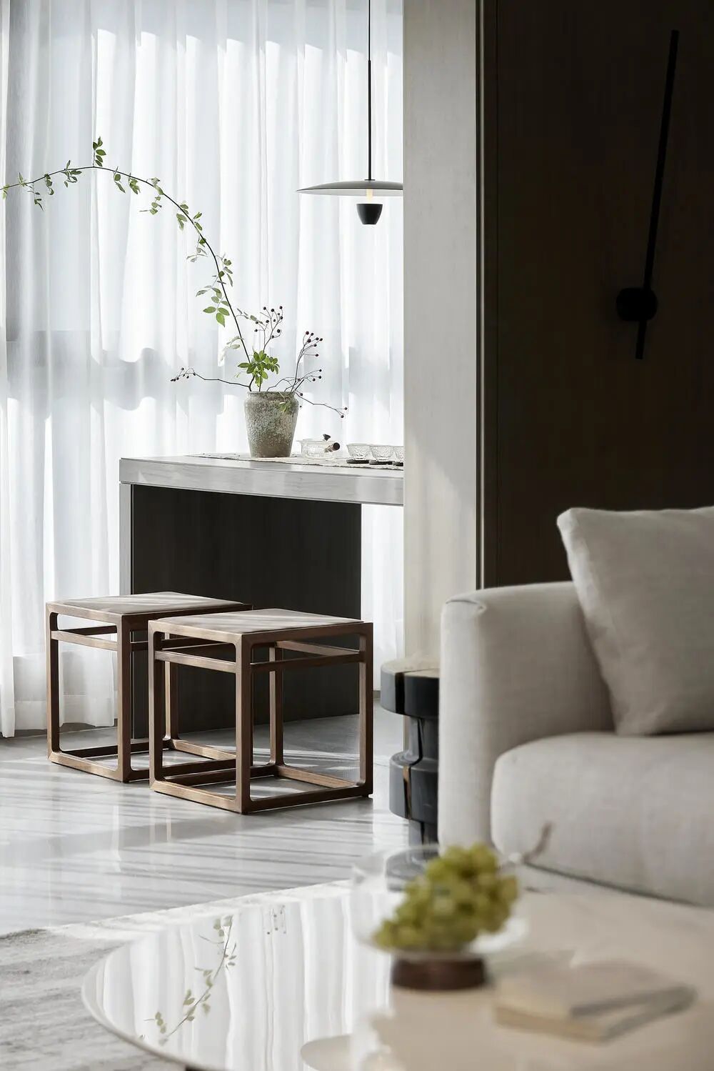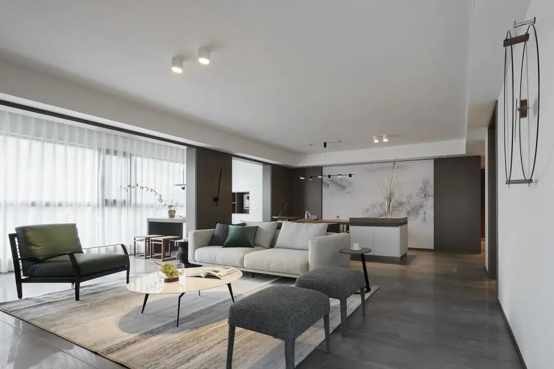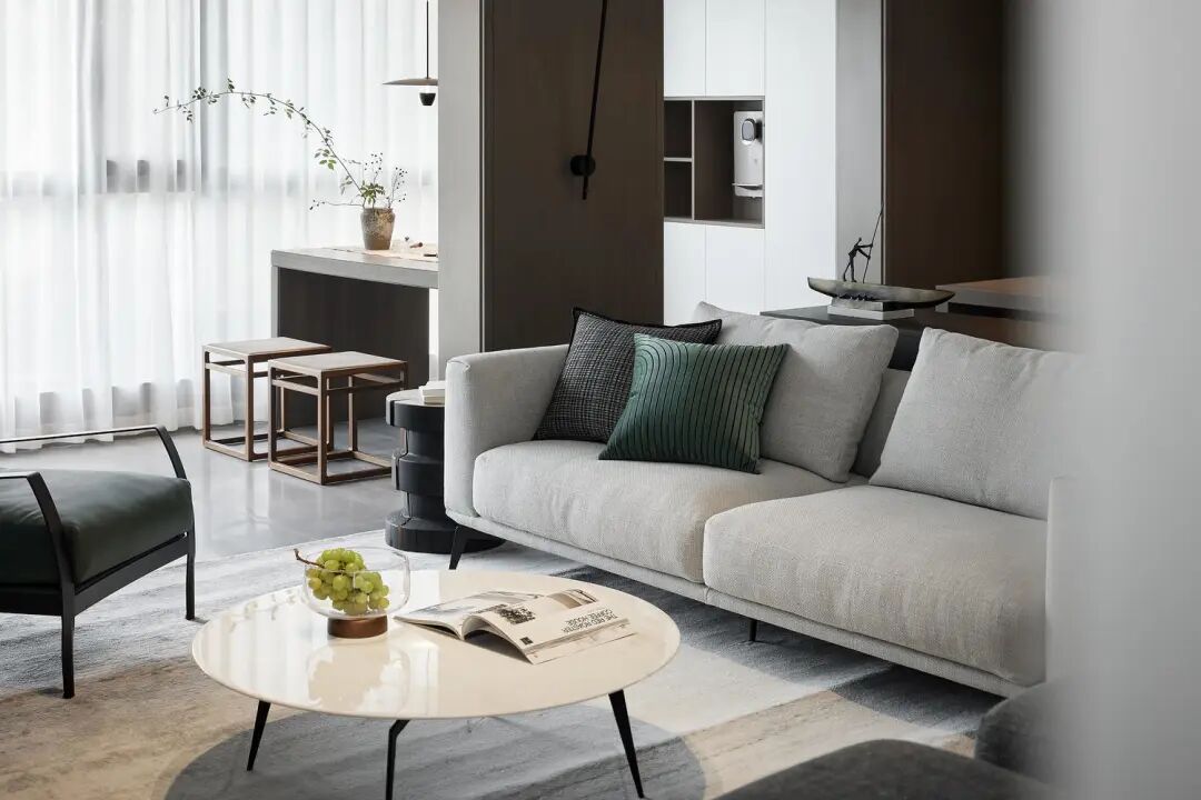 客厅以色块的状态拼组构成,线条的变化与延生让整个空间形成向上的态势。长而空的墙面,无一物又无限,让架构钟表的将白墙作为怀抱,向内伸展,作为精神居所。