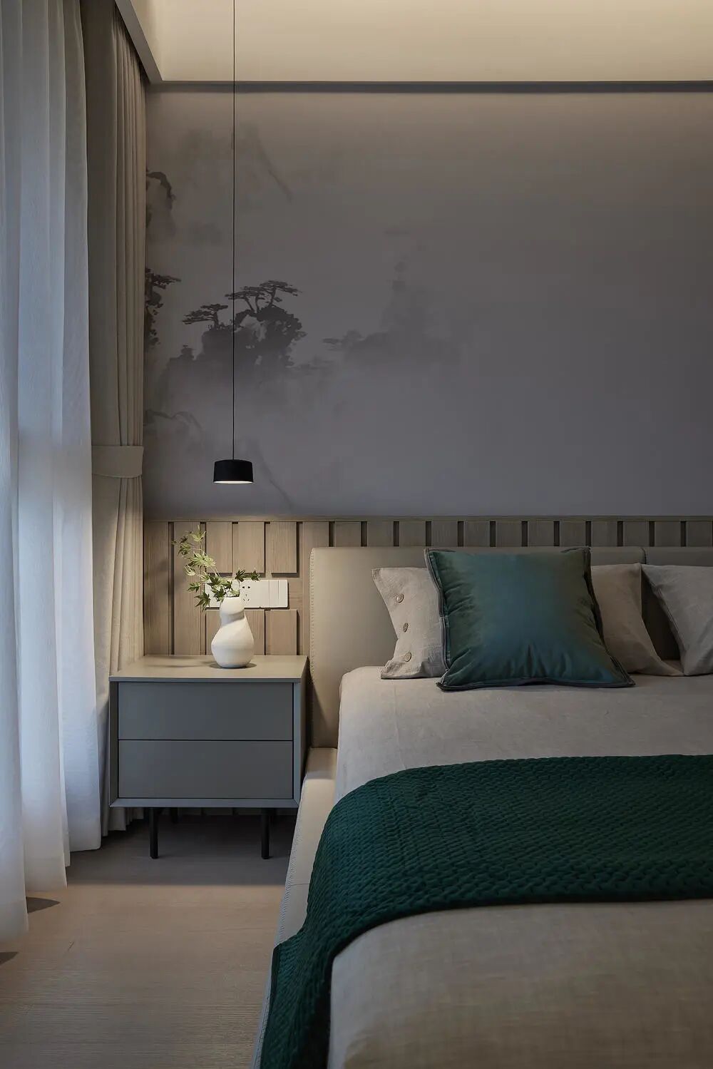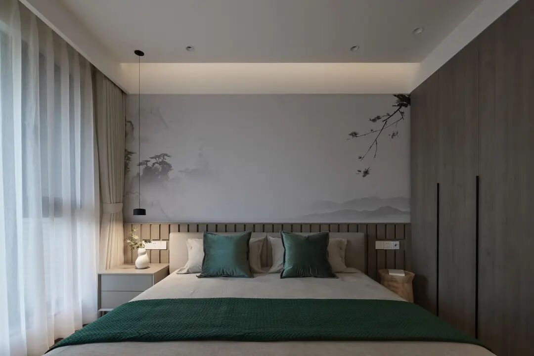 木地板搭配极简床头天然木纹,自然舒适。简洁小巧的灯束,悠然静谧,时间在此刻在这里自然慢下来了脚步。