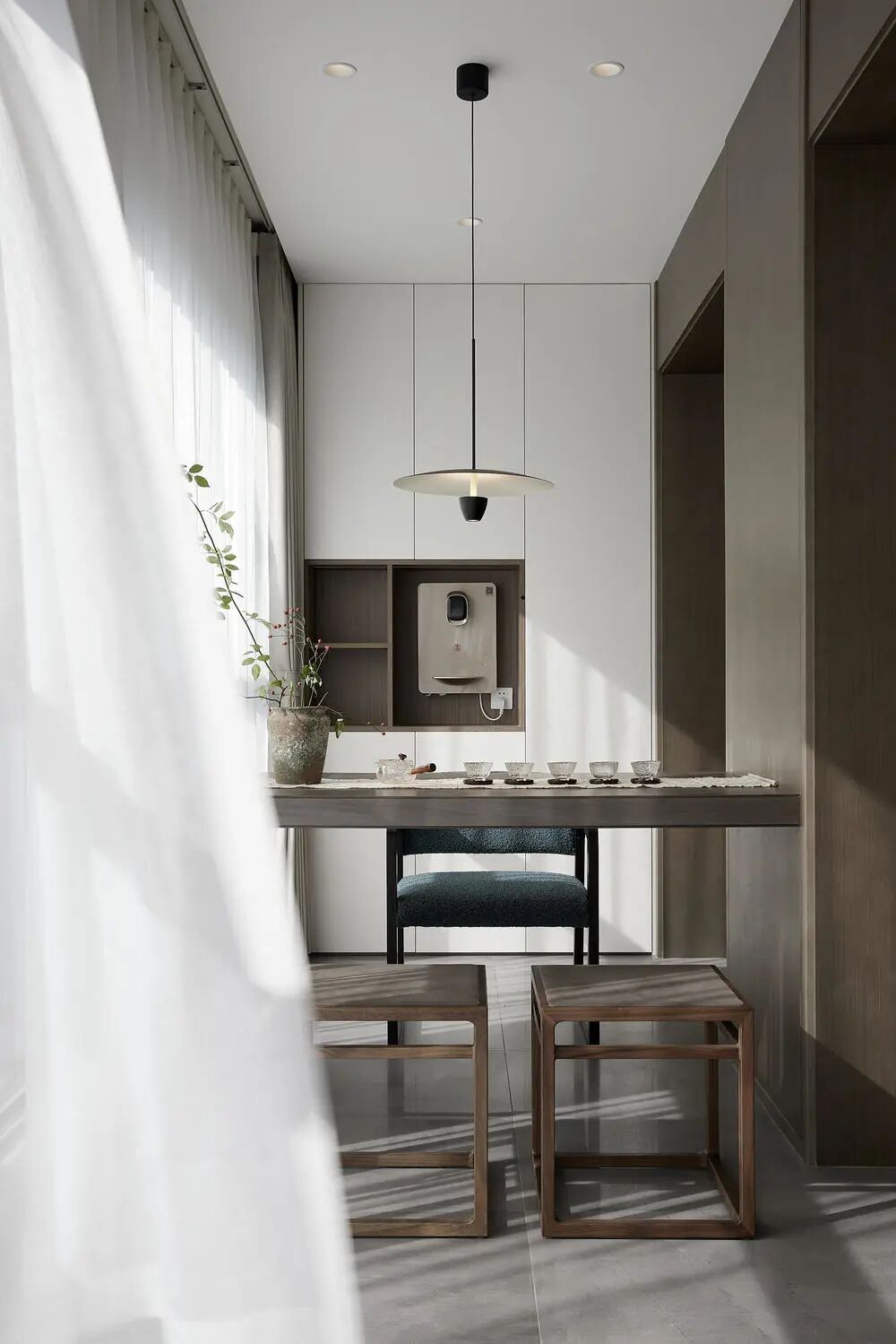 天然的胡桃与沉稳含蓄的紫砂壶,在窗外鸟语的对话下,极简优雅。斑驳的光线展现独特的格调韵律。明媚的阳光让这里变得温馨舒适,别有洞天的墙体被恰到好处的利用起来,窗外的枝繁叶茂映衬了茶香,守护着内心的安宁与祥和。