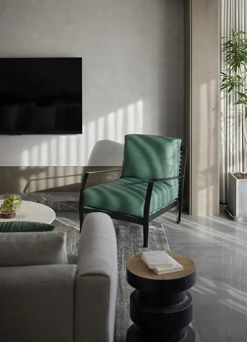 窗外树影婆娑,屋内清新绿意点亮空间,步入室内,情绪与紧绷了一天的筋骨瞬间放松下来,疲惫在推开房门那一刻自然卸下。