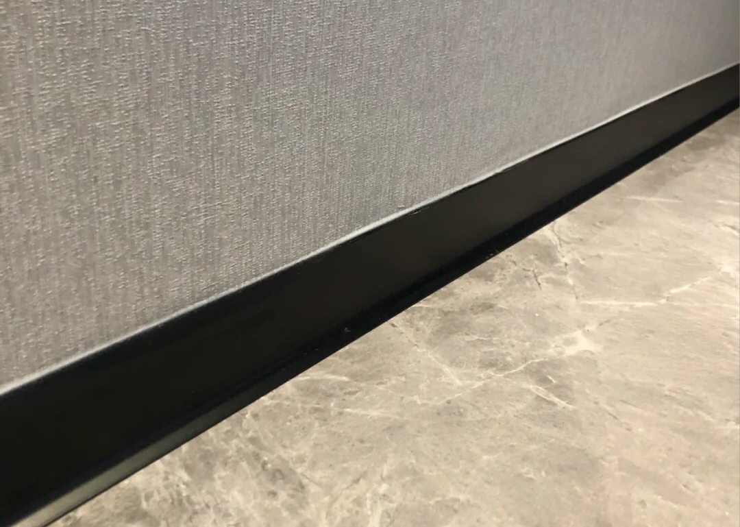 墙平式踢脚线,可以更好地弱化踢脚线的存在,而且不会突出墙面。将墙底开槽,开槽的高度和踢脚线的高度保持一致,把踢脚线和墙面融合。