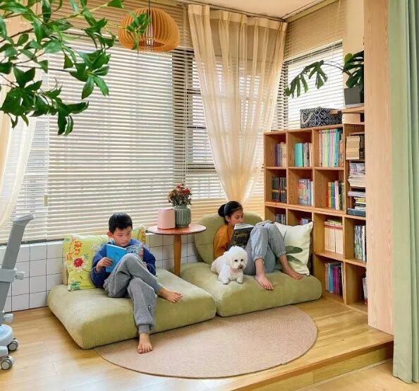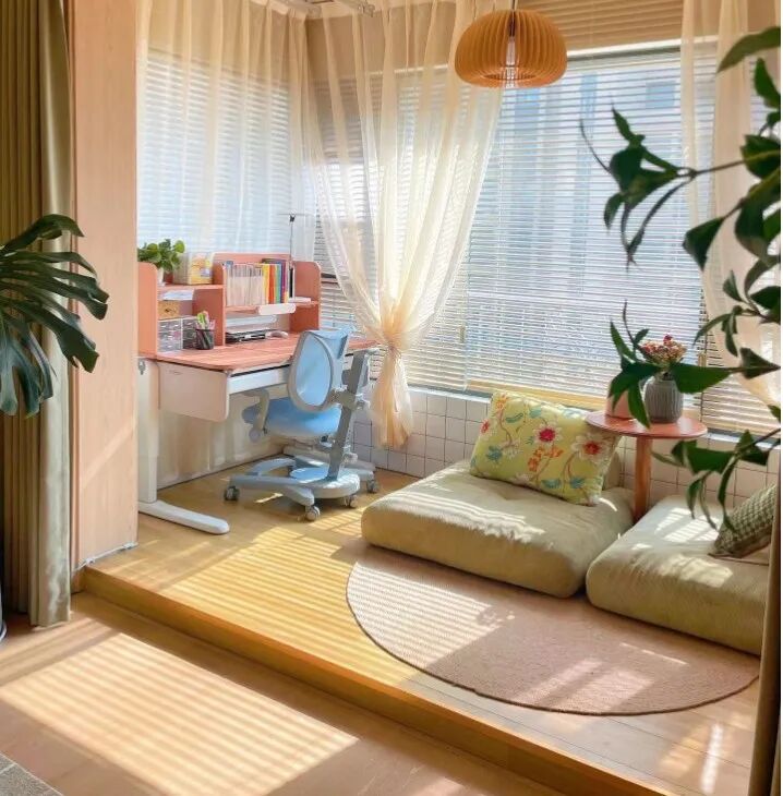 阳光读书角:同样可以做小书房,书桌和书柜都搬到地台。阳光的沐浴下,感受室外风景如画,室内书香满溢,让孩子愿意花更多时间学习。