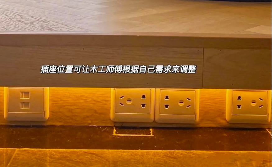 地台边缘建议适当留空,内嵌灯带,主要为辅助照明,也能适当提醒避免磕碰;靠外侧边要记得预留插座,方便解决用电问题。