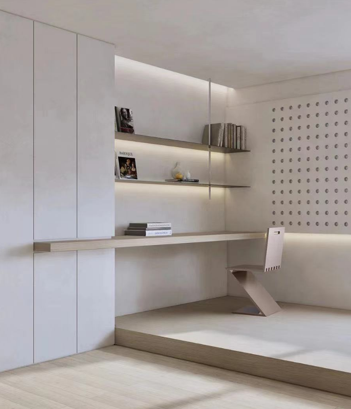 可以墙面做悬空架或者边缘做通顶柜,既让每一寸地方都物尽其用,而且丰富整体空间的层次,使得家居充满立体感和现代感。