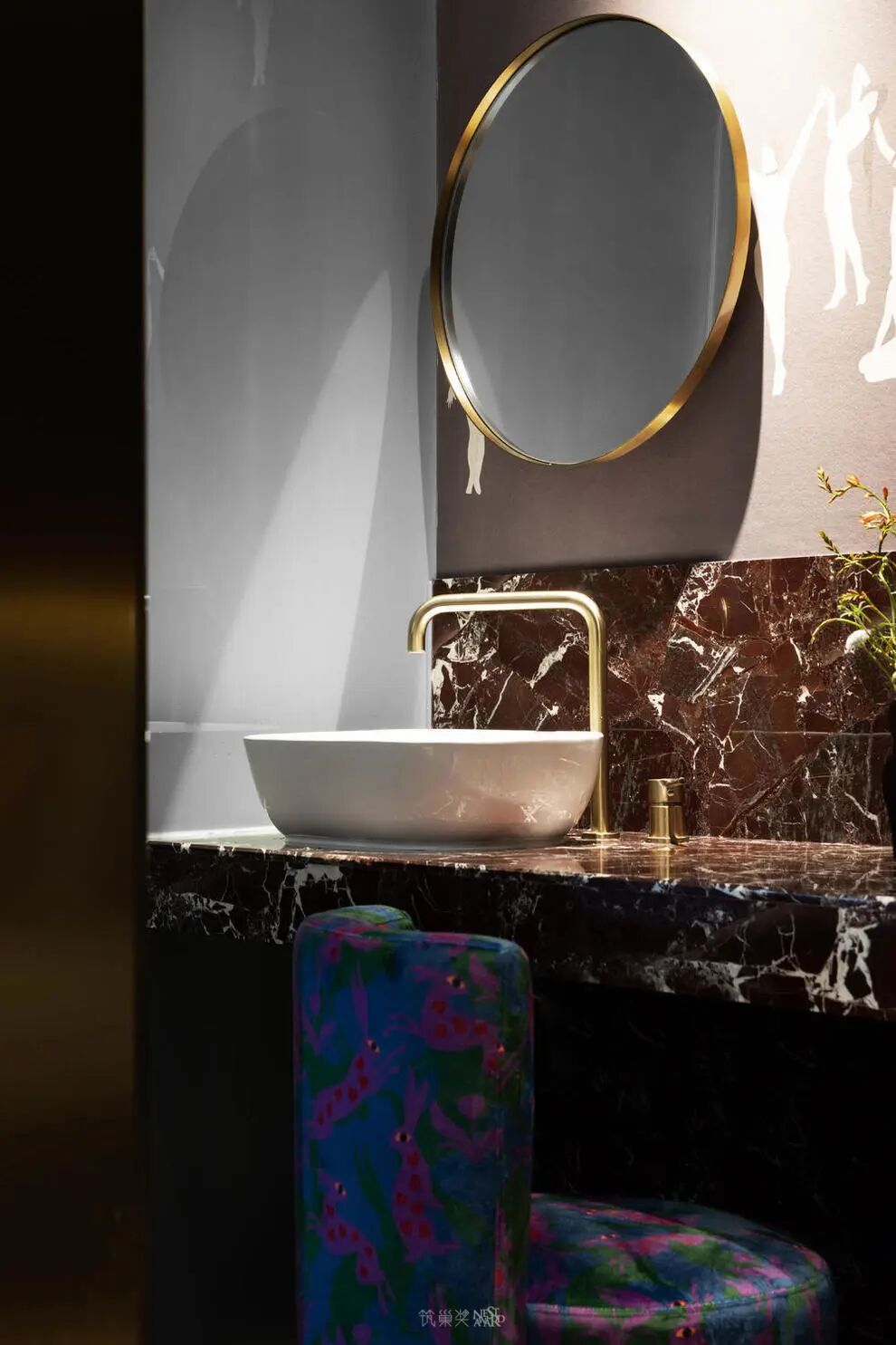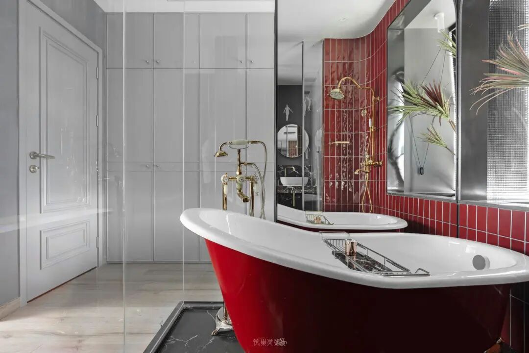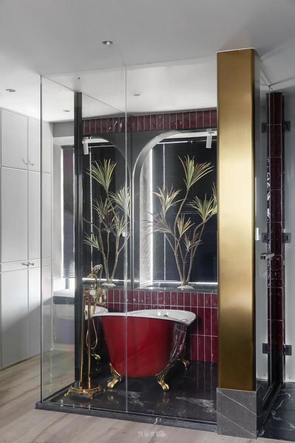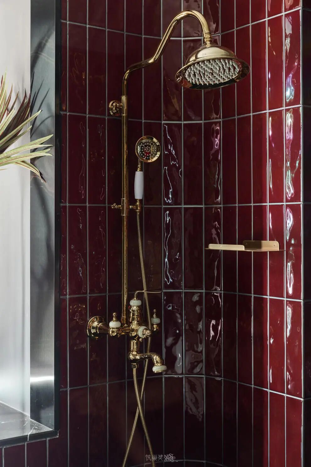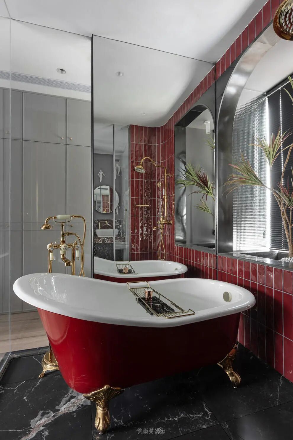 镜面让空间有了延伸感,酒红的墙砖搭配同色系浴缸,营造一种复古又神秘的氛围。