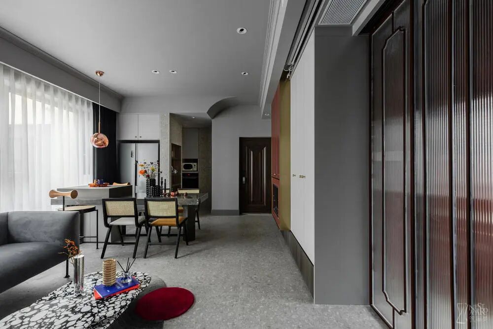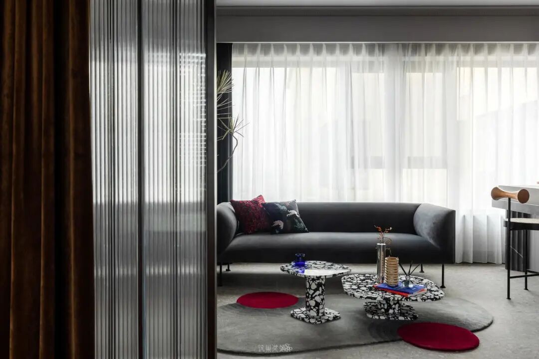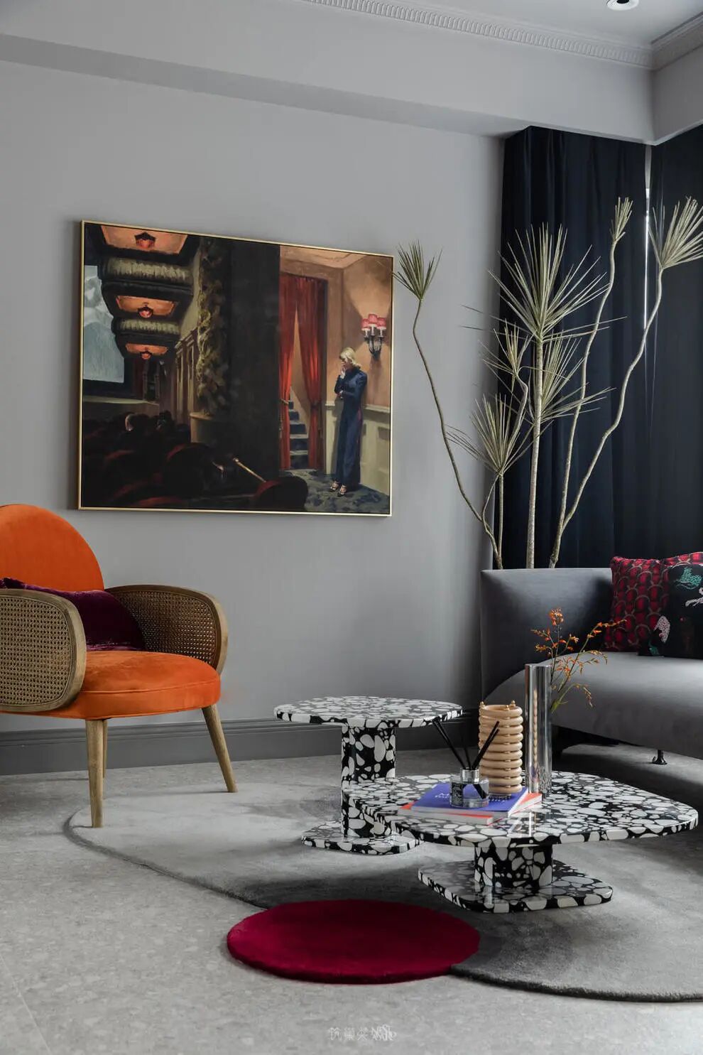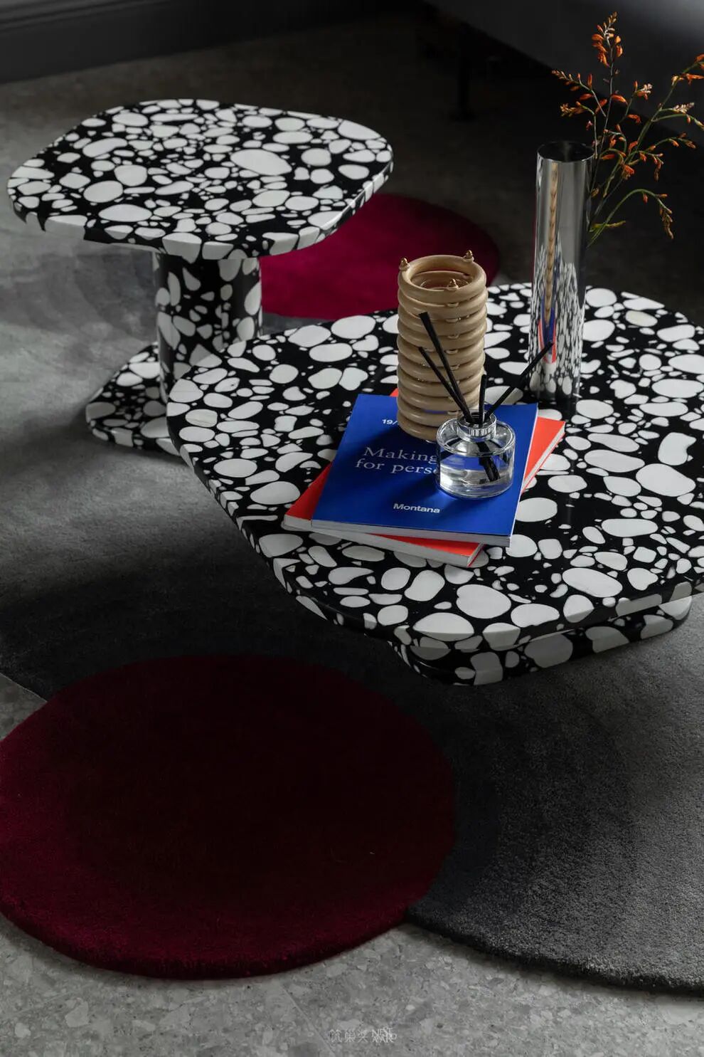 茶几的选择设计师希望可以在慵懒灰的色系中跳脱出来,所以用了这款黑白色块的水磨石,原版是Baxter的,找了一个商家来做的定制复刻,制作图是由设计师团队自己绘制,他们制作。地毯椭圆形的基础上配了两个紫红色圆形成不规则,恰好适合这个空间氛围。地毯也是复刻版。