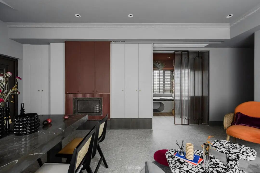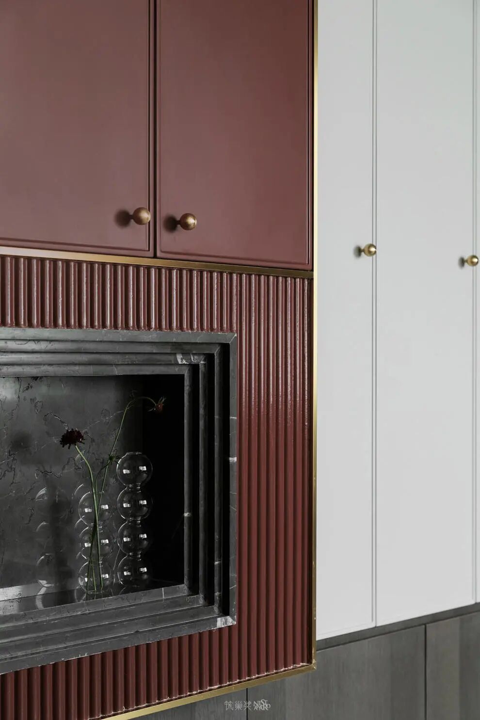 整排收纳柜长度有3.5米,深度是呈递进关系,进门左侧为鞋物收纳,酒红柜左右两侧深度为320mm,储藏小型杂物和换季鞋物,中间酒红色的柜子是以壁炉的形式呈现,来增添正面柜的层次和趣味性,恰好又可以对着餐桌,用酒红来突出型,弱化两侧柜子。