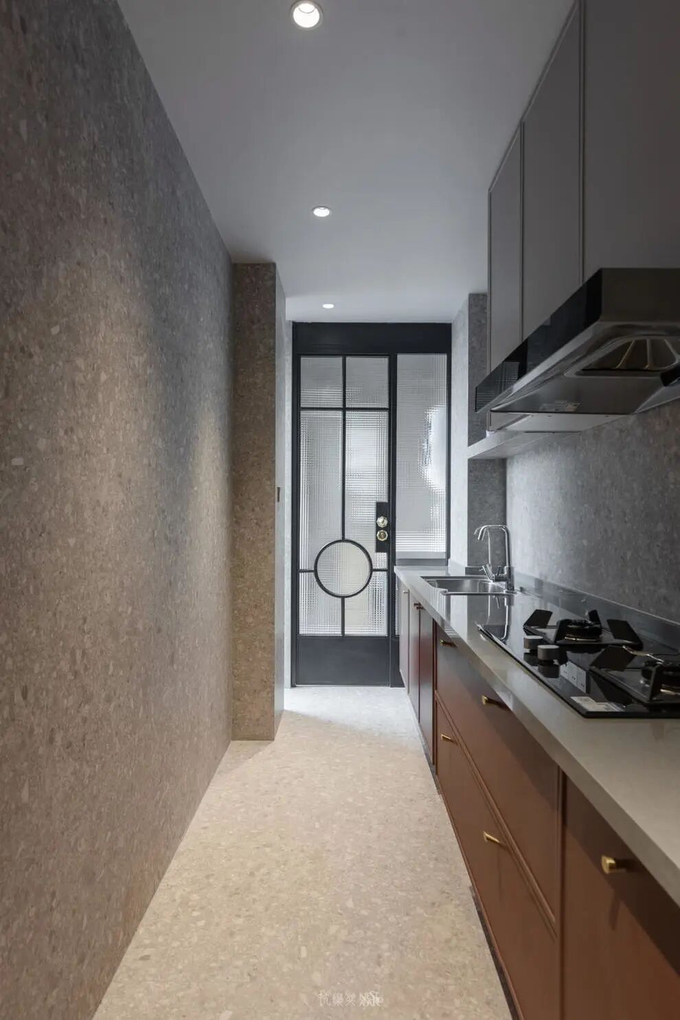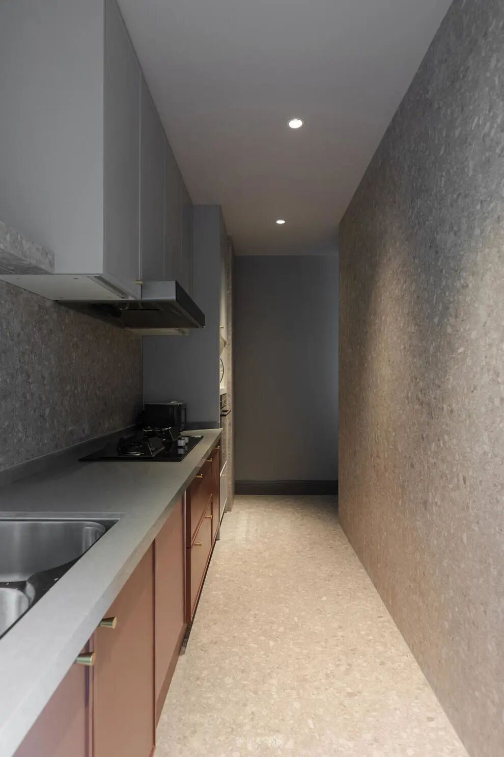 原本5平,改造后7平。厨房结构是长条形,可改性很低,设计师只做了两个动作来改善使用功能,占用了一小部分生活阳台,让厨房有一处高柜可以放置微波炉和嵌入式烤箱,对开门冰箱移至餐厅区域。