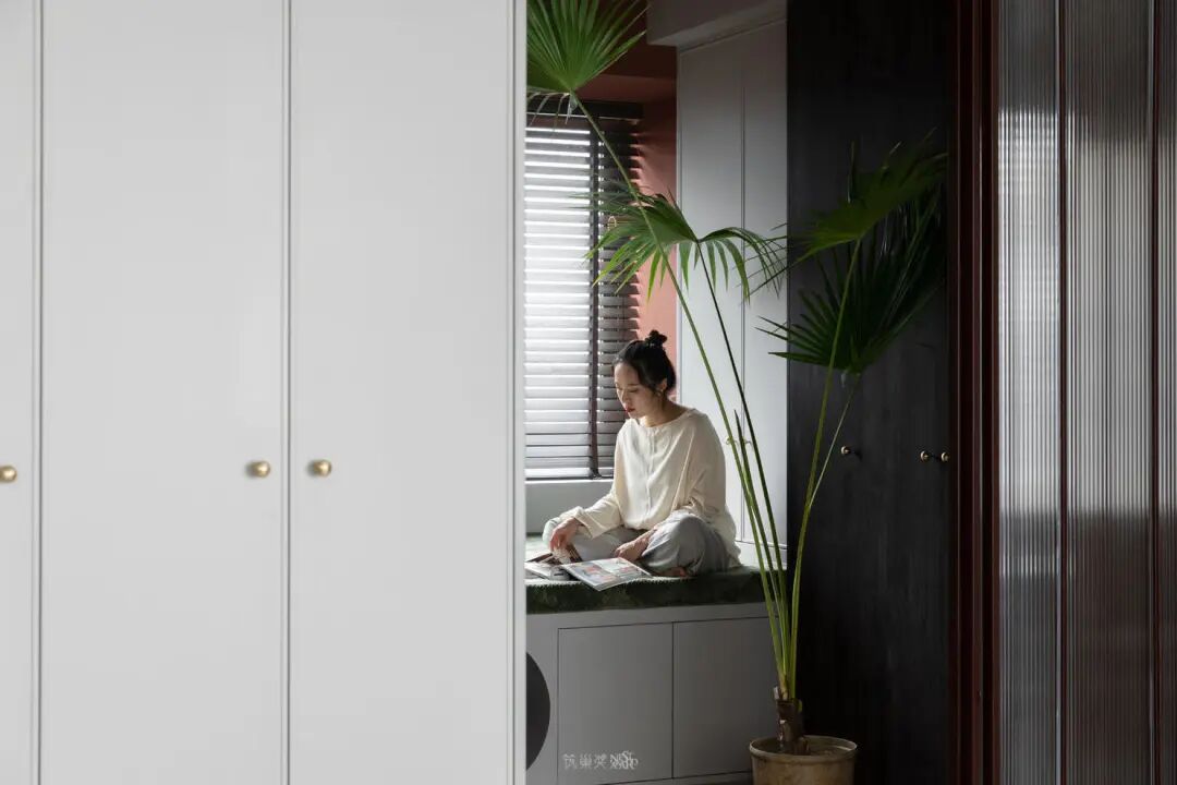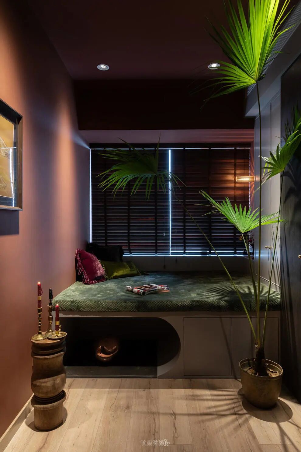 飘窗台上是加砌了一个小花池来增添观景趣味,因为外面实际没有绿意葱葱的景致。如果不想打理植物可以 用仿真植物来替代,设计师在花池内部有做溢水槽,方便里面积水排出。