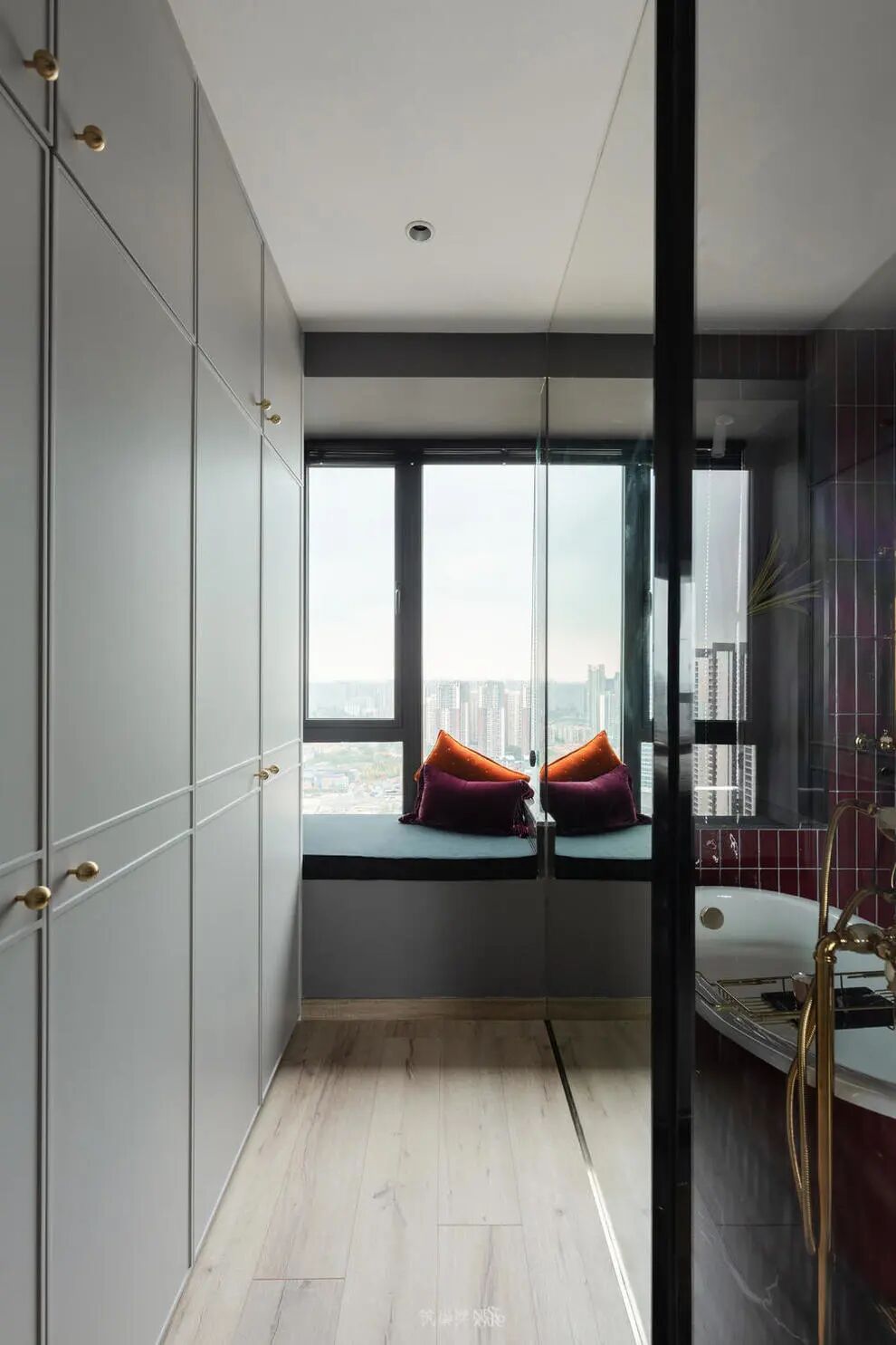 淋浴间有3平方,地面有做开槽加地坪抬高来铺设排水管, 浴缸与衣帽间的隔墙是做了双面镜子,一来可以解决衣帽间全身镜问题,二来可以让淋浴空间和衣帽间通过镜面反射从而使空间看起来更宽敞。