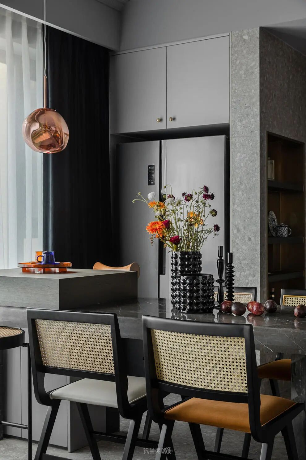 同时可以增加用餐氛围和食欲。整排柜子的下部分用的胡桃木饰面也是收纳柜,是翻板门开启方式。手法是用了像高踢脚线的形式来呈现。