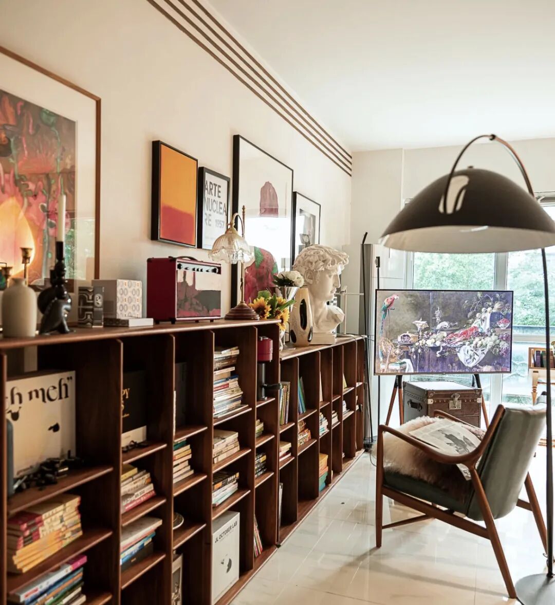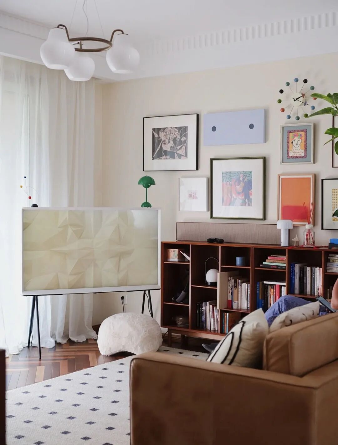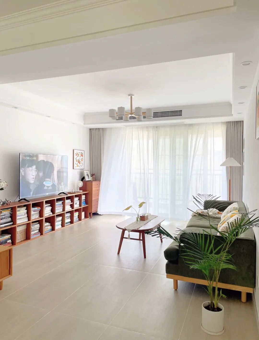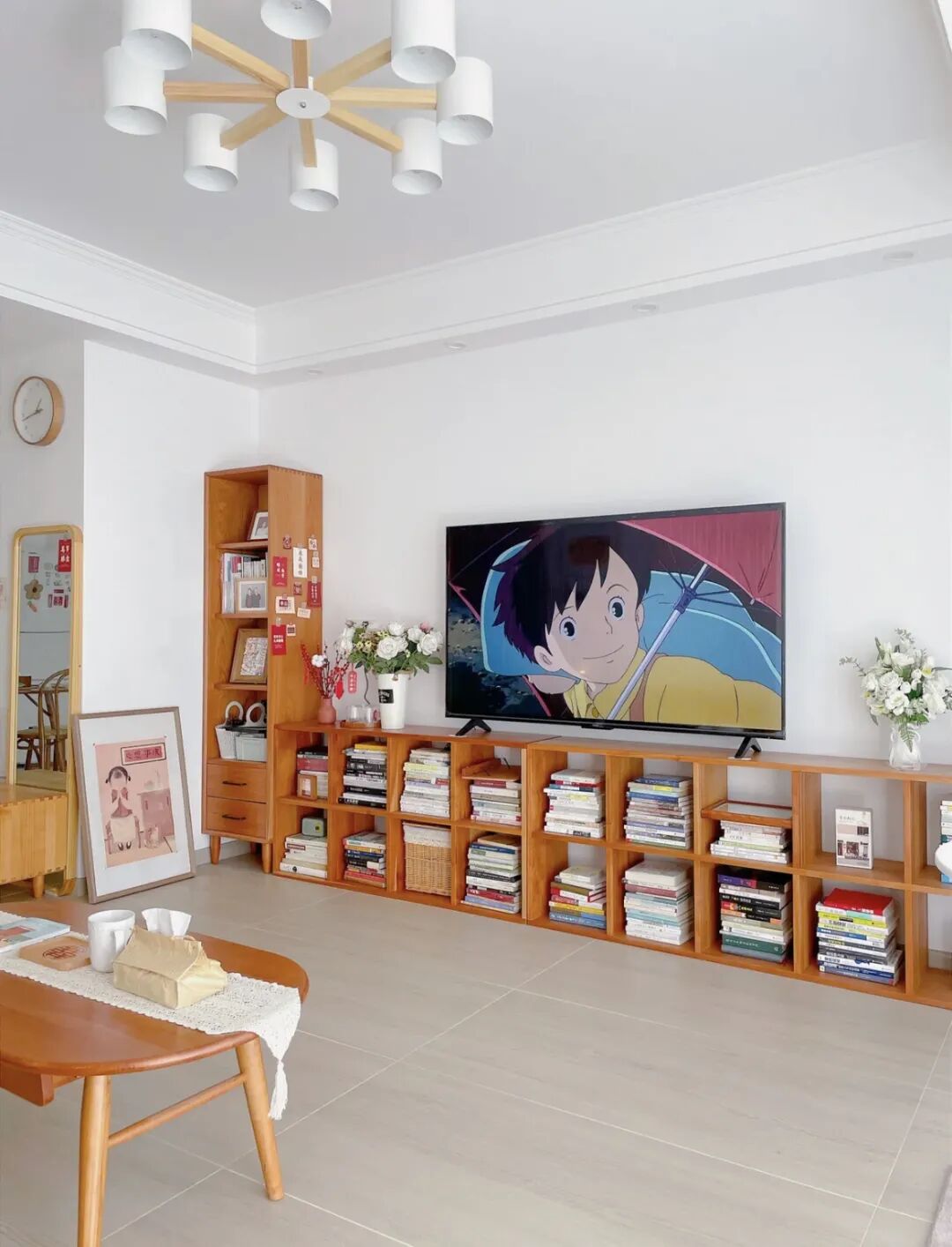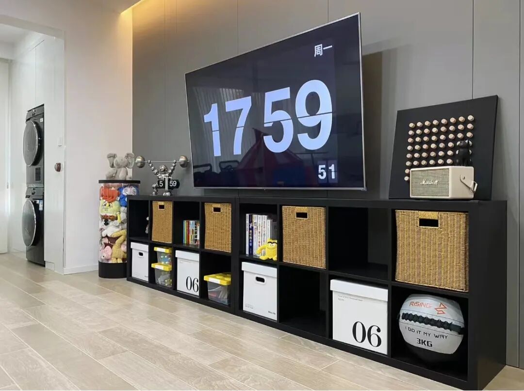 电视在爸妈眼中可是客厅标配,将传统电视柜换成遮挡性更好、高度更高的半柜,既可以增加储物,又能够让背景墙看上去不会过于空旷。比如组合式的单元格书架,既不影响电视的摆放,还能够根据自己的喜好进行安排设计。