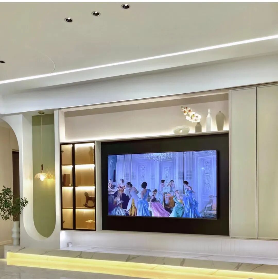 另外一种就是嵌入式背景墙,除了具有很好的装饰效果和不落灰之外,储物功能也是没话说。储物柜电视墙+嵌入式电视的设计,家里很多东西都可以统统放在里面,储物功能直接翻倍。