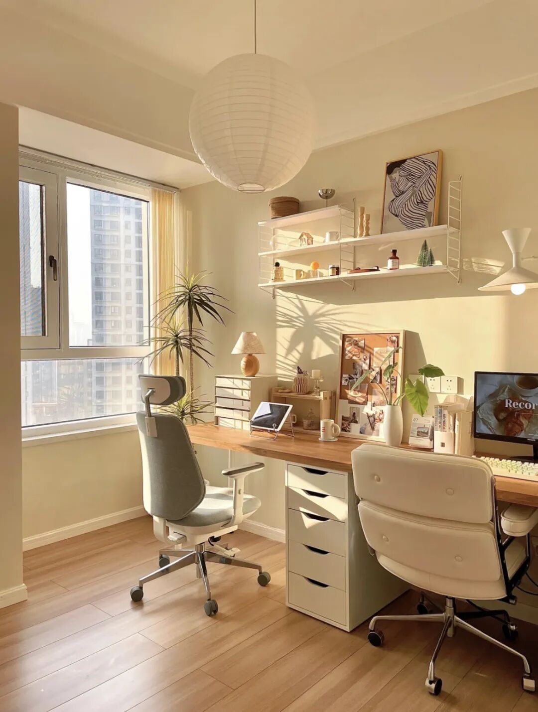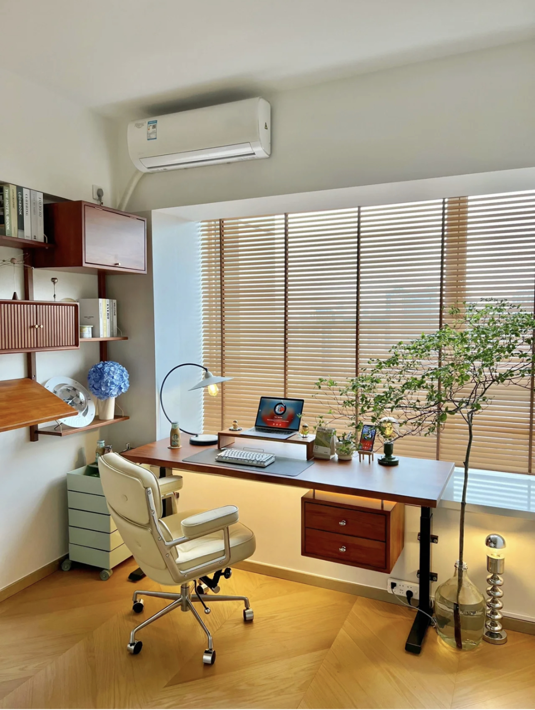 重点是并不影响进行其它位置的设计。选择轻便的桌椅,书架上墙,纵向增加储物空间也不占地方。在这里读书、工作、开会,享受自己的时间,也没人打扰。既可以享受自己的生活,也不用担心会和父母产生分歧。