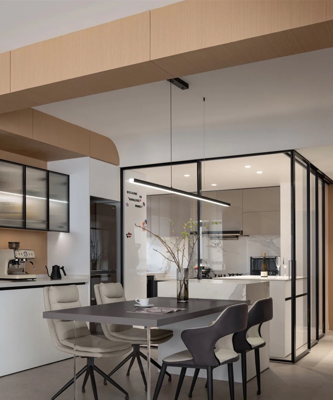 L型联动推拉门、三联动隐藏玻璃推拉门解决,直接把厨房做成一个可开放、半开放和封闭的设计。平时就是一个开放式,可以在吧台活动,当做饭的时候玻璃门一关,完全与油烟隔绝。
