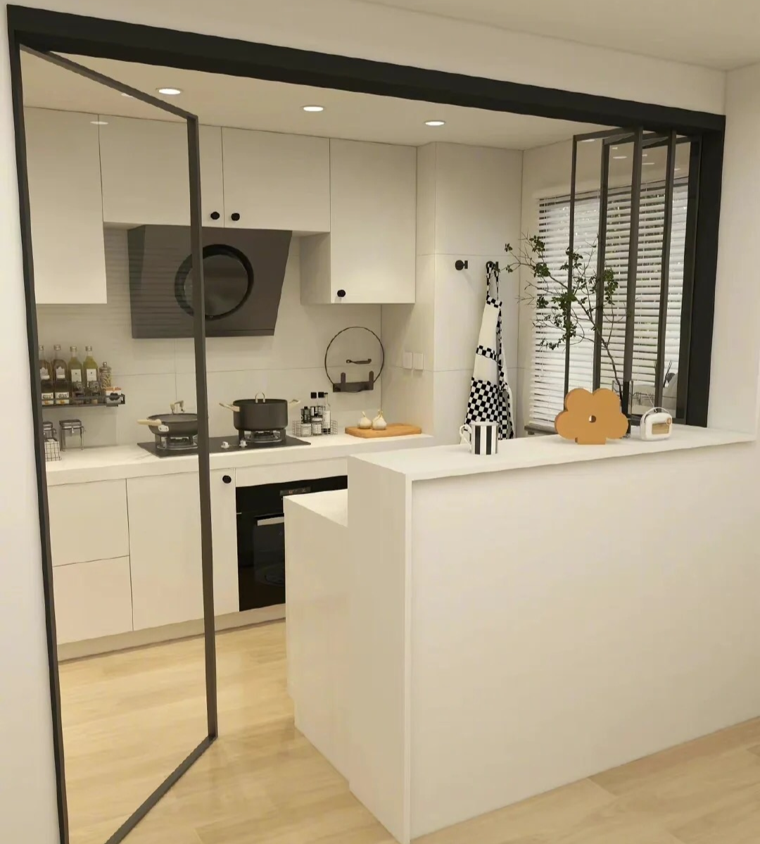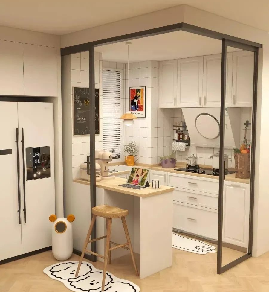 另外还可以墙体全部拆除做吧台,一定要缩小吧台尺寸,窗户和门做成折叠或联动式,实现可开可合的厨房设计,做饭时关上来阻挡油烟,厨房门窗打开,就是一个开放式的空间。