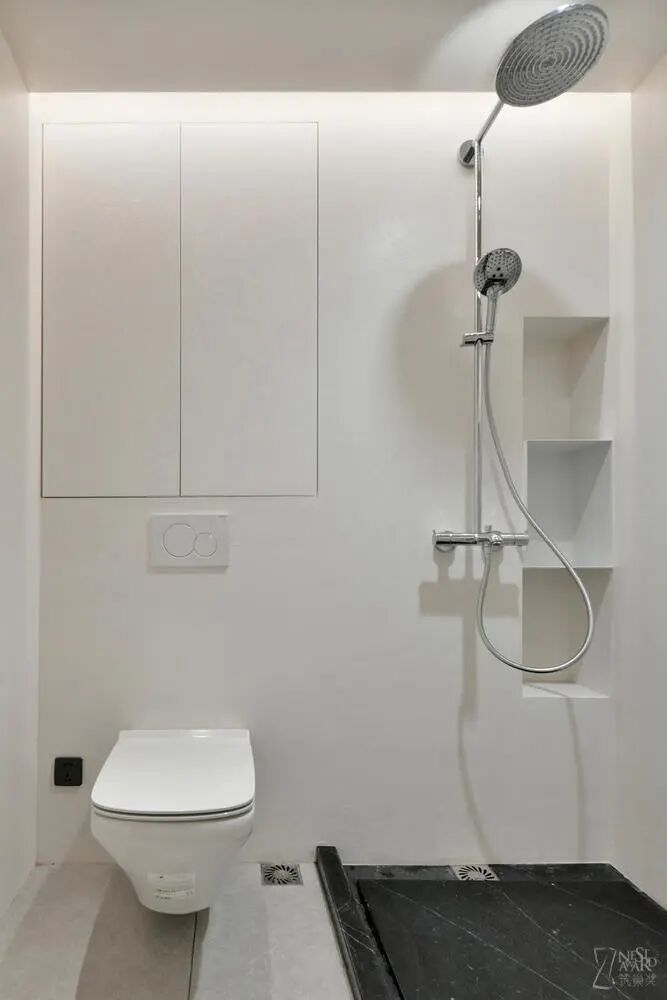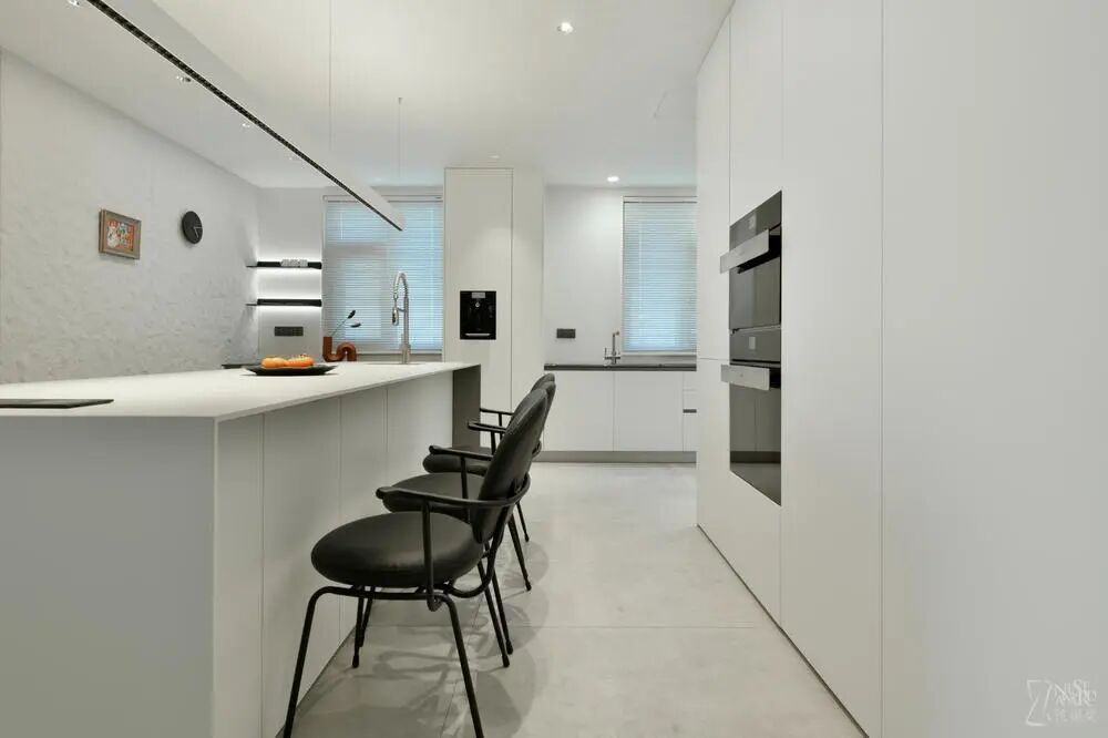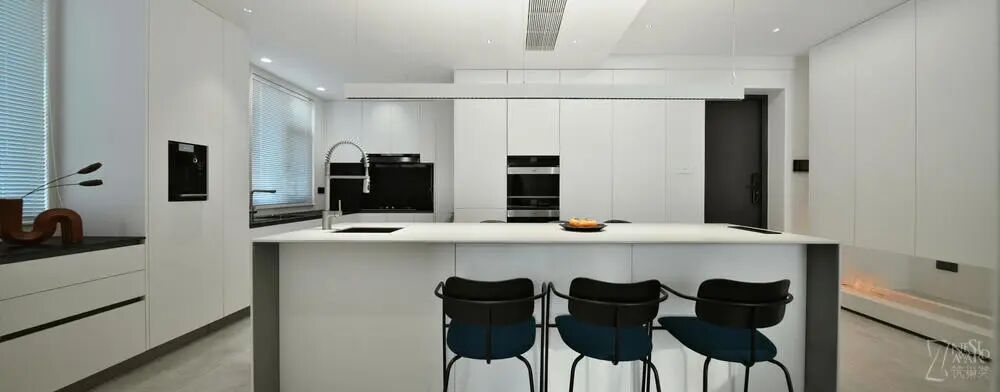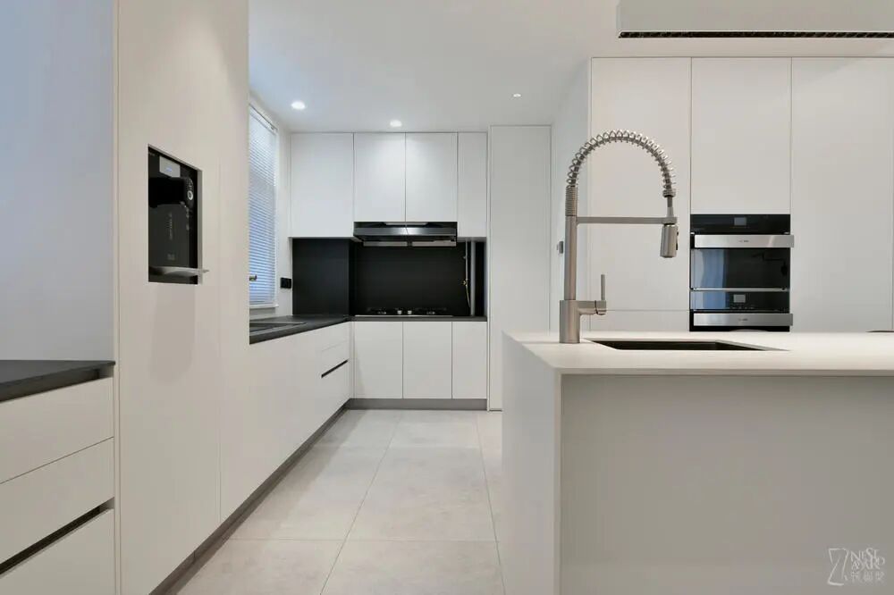 弥漫的白色,贯穿整个空间。白既是无,亦可是满。色彩延续至厨房,充足的储物空间让整体看上去空无一物,实际处处烟火。