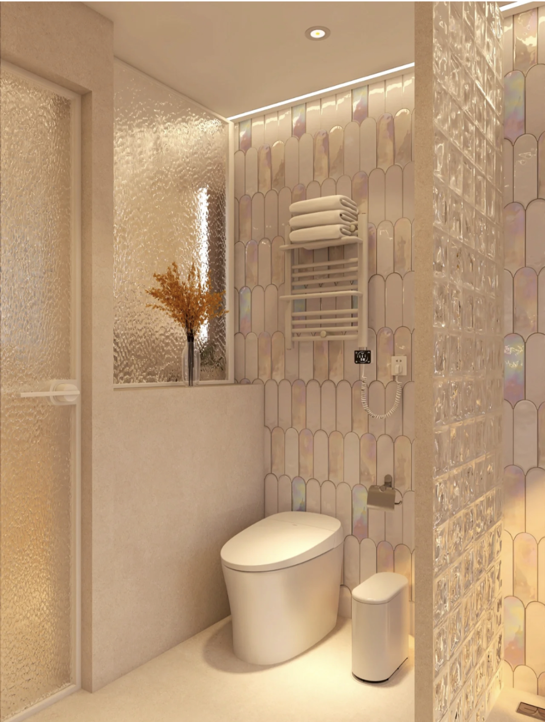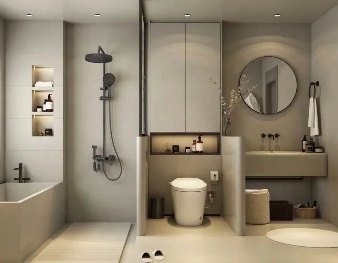 玻璃砖可以说是卫生间的救星了,玻璃砖防水,防潮,易清洗,兼顾隐私,半透明的质感能最大程度地引入自然光同时保障隐私,用来做干湿分离的隔断显然是个不错的选择,可以很好地解决暗卫问题。