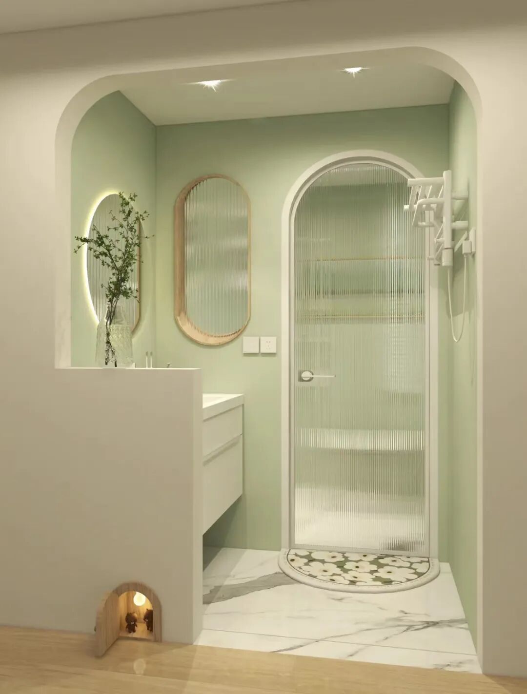 移到外侧的洗漱台,需要单独砌一堵墙做分隔,可以选用实墙不到顶的形式,留出部分空间用玻璃砖填充,通透的同时又有装饰效果。